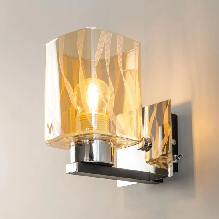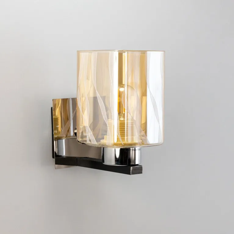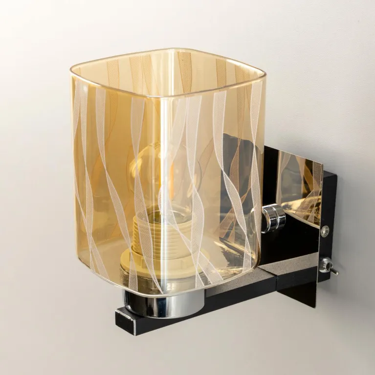 Основание бра изготовлено из металла, что обеспечивает его долговечность и надёжность. Плафон выполнен из качественного стекла, которое не теряет своего первоначального вида со временем. Светильник имеет один патрон под лампу с цоколем E14, что позволяет использовать различные типы ламп.
