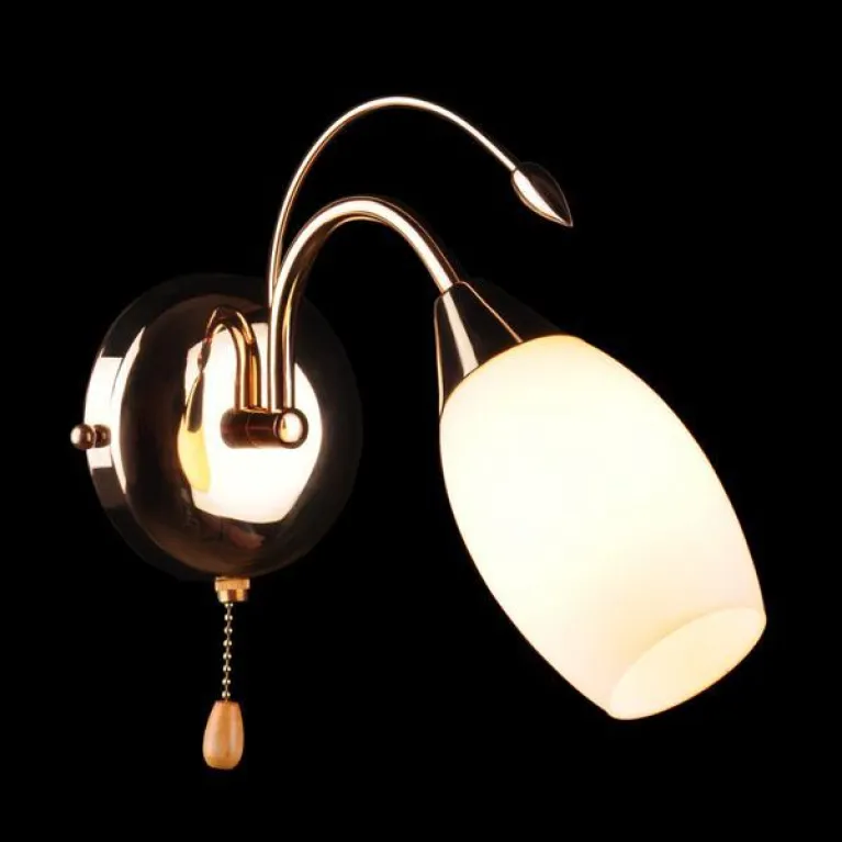Бра оснащено одним плафоном, изготовленным из прочного и долговечного стекла. Плафон имеет лаконичную цилиндрическую форму и полупрозрачную поверхность, которая придаёт свету мягкий и приятный оттенок. Основание выполнено из высококачественного металла и имеет стильное золотое покрытие, придающее изделию роскошный вид.