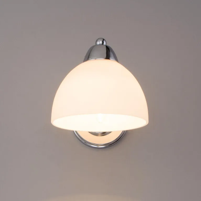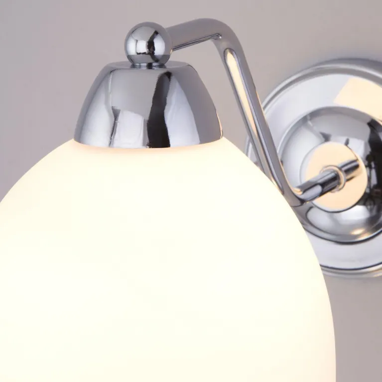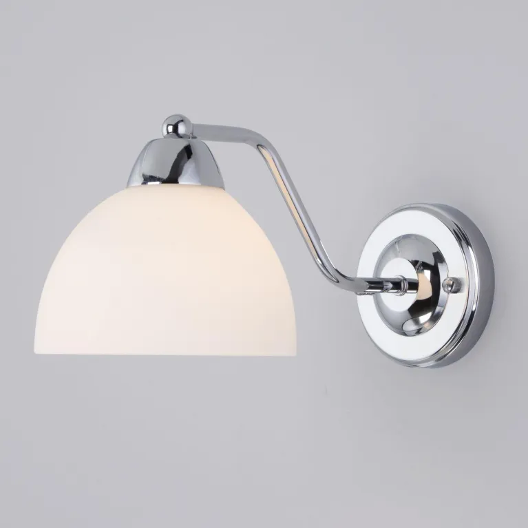 Корпус светильника изготовлен из прочного металла с хромированным покрытием, которое придаёт изделию современный и элегантный вид. Плафон из белого матового стекла обеспечивает мягкое и равномерное рассеивание света, создавая комфортное освещение в помещении.