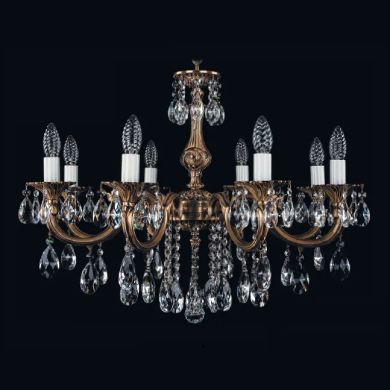 Преобладающий цвет люстры: Золотой, арматуры: Золото; материал изготовления арматуры: Металл, размеры, мм: / высота 600 / диаметр 700. Общая мощность – 320 Ватт, а максимальная площадь освещения до 17,8 м2. Основной тип ламп, предусмотренный производителем: Накаливания с цоколем E14. В зависимости от предпочтений можно использовать лампы теплового, холодного или нейтрального света, за исключением люстр с типом цоколя LED.