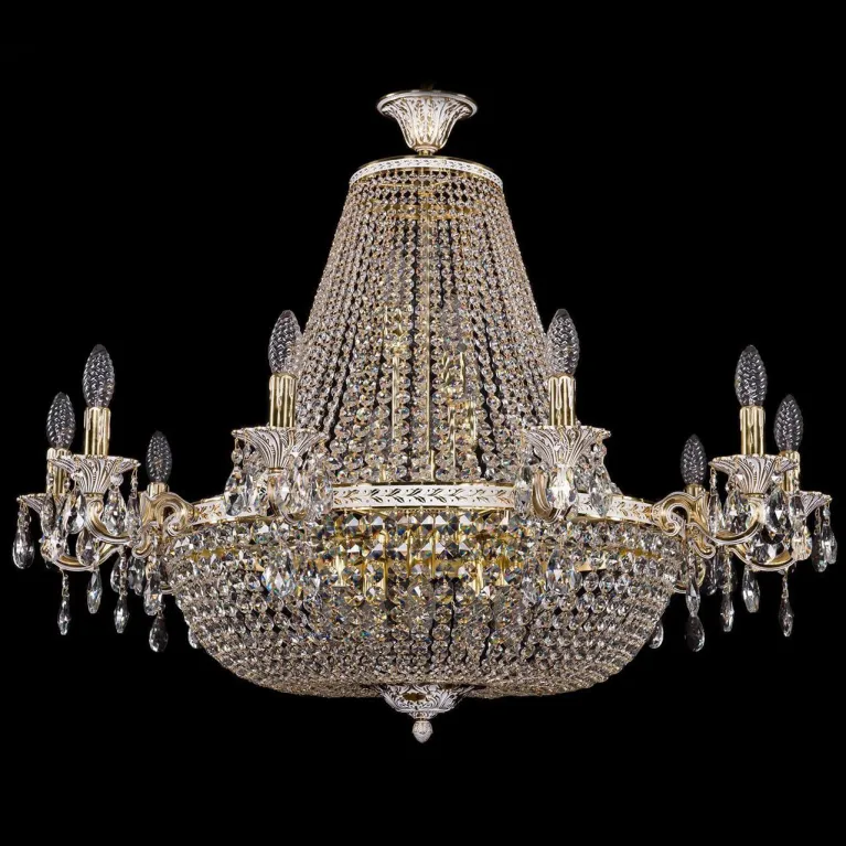 Преобладающий цвет люстры: Золотой, плафонов: Прозрачный, арматуры: Золото; материал изготовления арматуры: Металл, размеры, мм: / высота 700 / диаметр 950. Общая мощность – 800 Ватт, а максимальная площадь освещения до 44,4 м2. Основной тип ламп, предусмотренный производителем: Накаливания с цоколем E14. В зависимости от предпочтений можно использовать лампы теплового, холодного или нейтрального света, за исключением люстр с типом цоколя LED.
