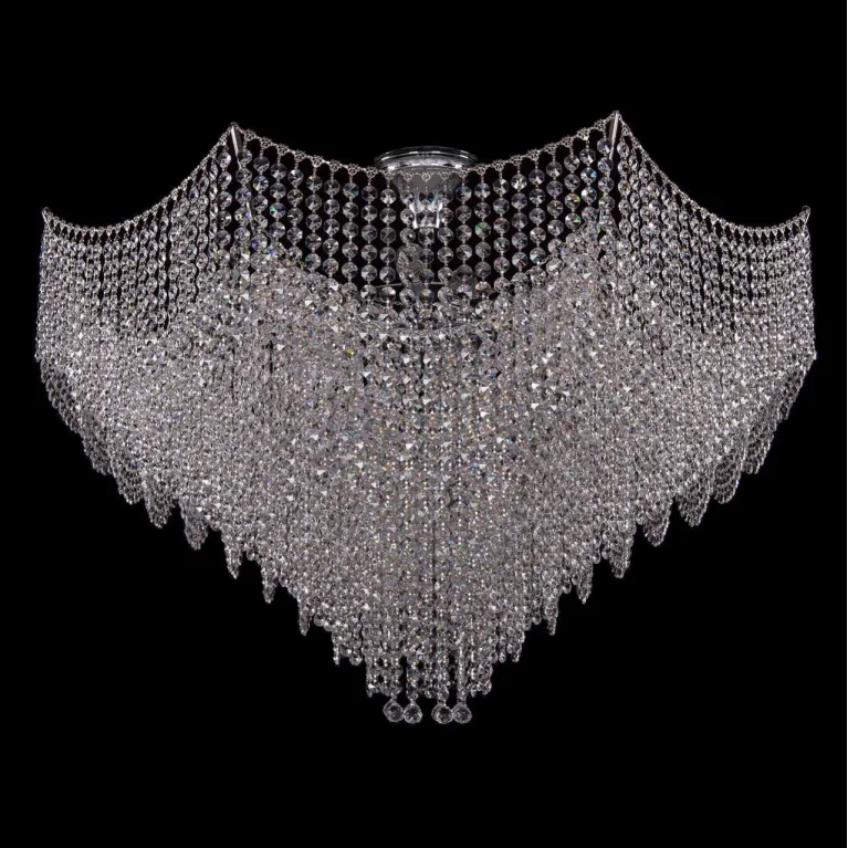 Люстра выполнена в стиле ампир и украшена изящными хрустальными подвесками, которые придают ей неповторимый шарм и блеск. Основание изготовлено из никелированного металла, что обеспечивает долговечность и стойкость к внешним воздействиям.