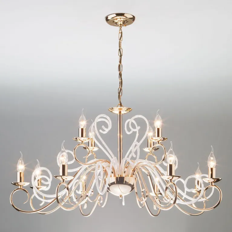 Преобладающий цвет люстры: Золотой, арматуры: Золото; материал изготовления арматуры: Металл, размеры, мм: / высота 466 / диаметр 980. Общая мощность – 720 Ватт, а максимальная площадь освещения до 58 м2. Основной тип ламп, предусмотренный производителем: Накаливания с цоколем E14. В зависимости от предпочтений можно использовать лампы теплового, холодного или нейтрального света, за исключением люстр с типом цоколя LED.