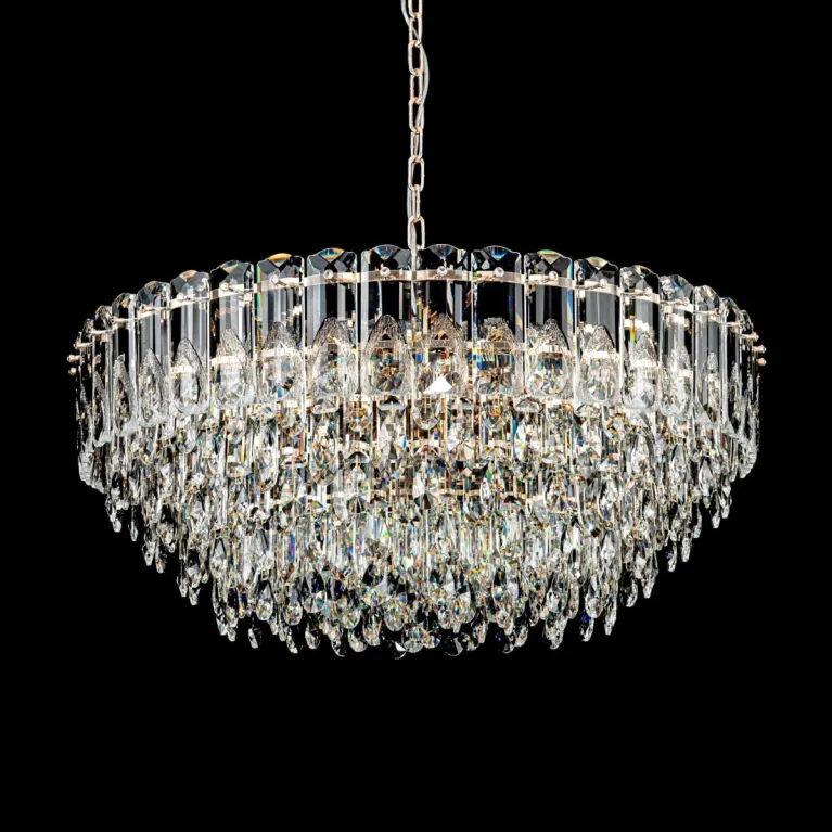 Преобладающий цвет плафонов: Прозрачный, арматуры: Хром; материал изготовления арматуры: Металл, размеры, мм: / высота 1200 / диаметр 800. Общая мощность – 880 Ватт, а максимальная площадь освещения до 20 м2. Основной тип ламп, предусмотренный производителем: Накаливания с цоколем E14. В зависимости от предпочтений можно использовать лампы теплового, холодного или нейтрального света, за исключением люстр с типом цоколя LED.