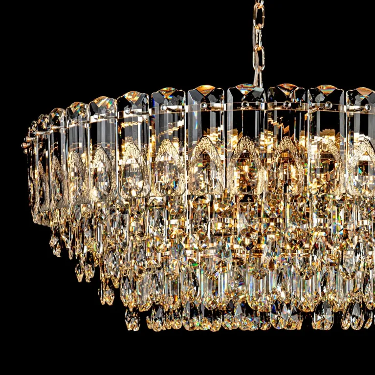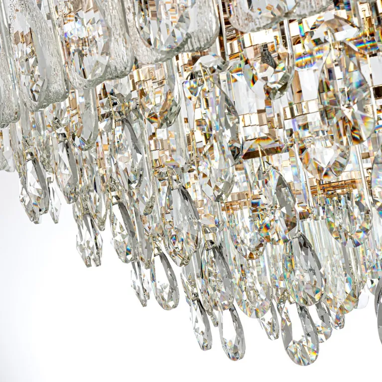 Преобладающий цвет плафонов: Прозрачный, арматуры: Золото; материал изготовления арматуры: Металл, размеры, мм: / высота 1200 / диаметр 800. Общая мощность – 880 Ватт, а максимальная площадь освещения до 20 м2. Основной тип ламп, предусмотренный производителем: Накаливания с цоколем E14. В зависимости от предпочтений можно использовать лампы теплового, холодного или нейтрального света, за исключением люстр с типом цоколя LED.