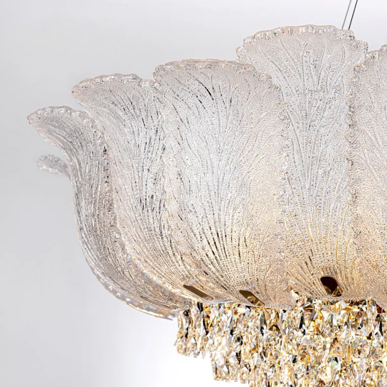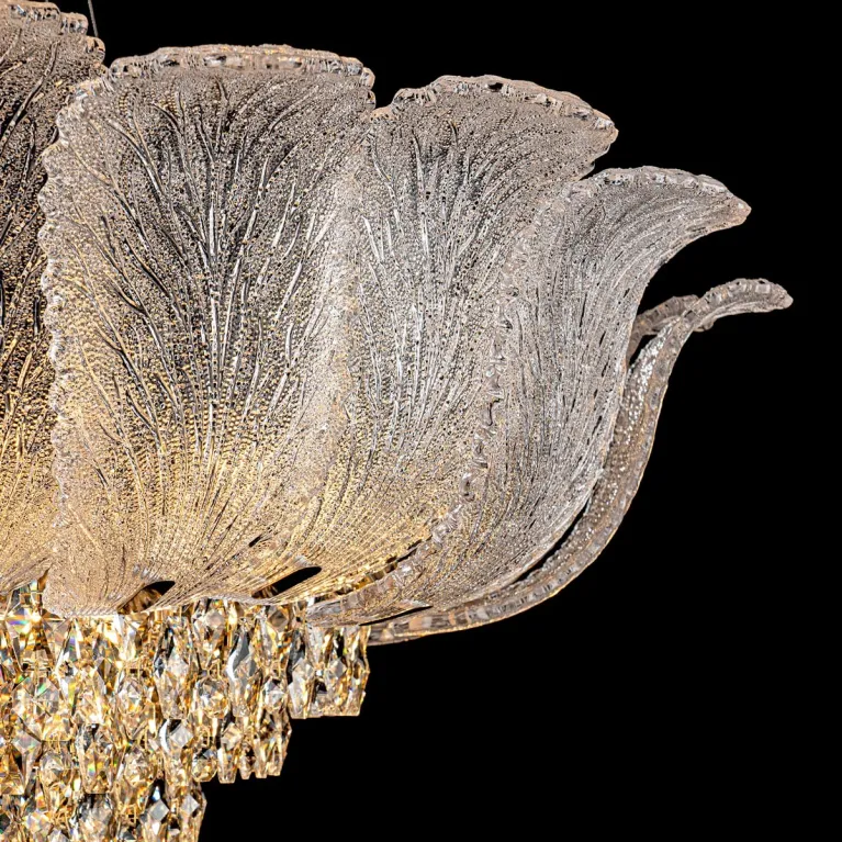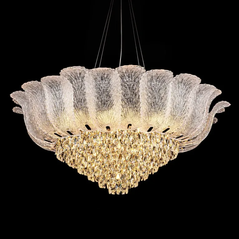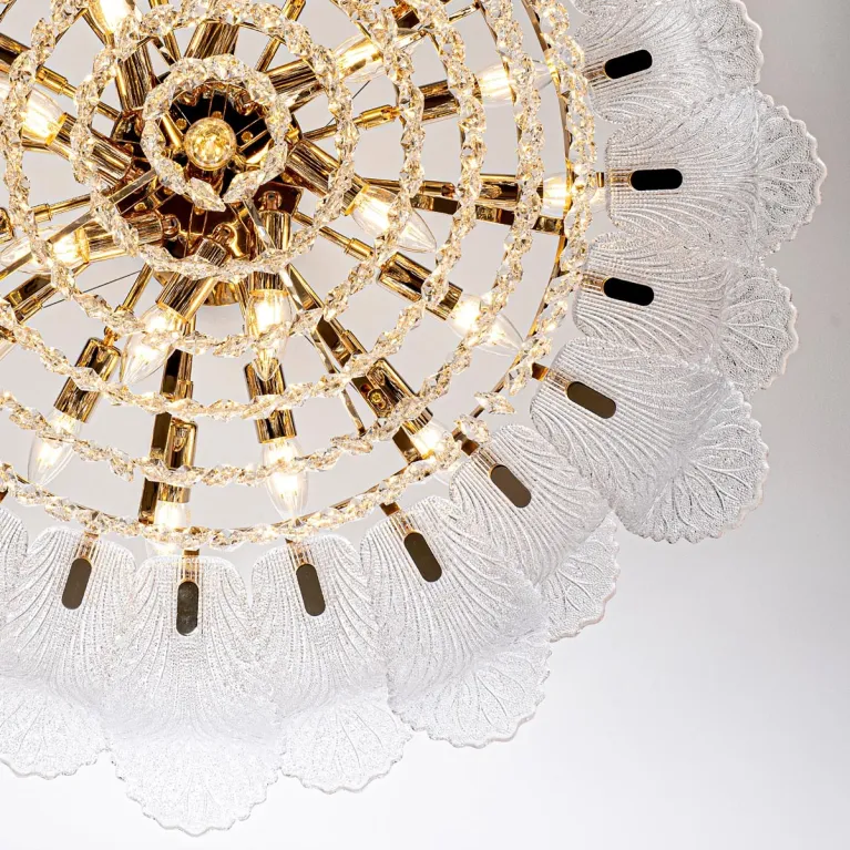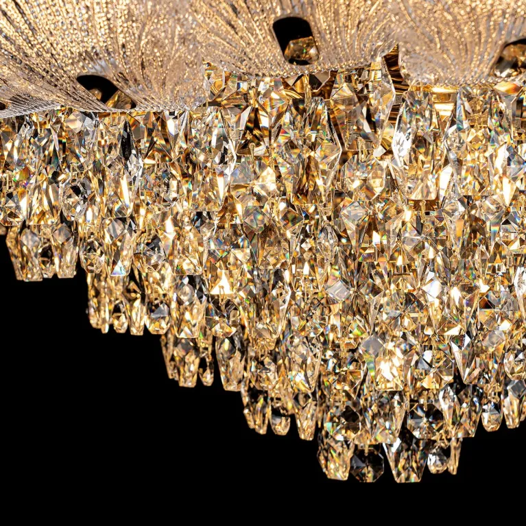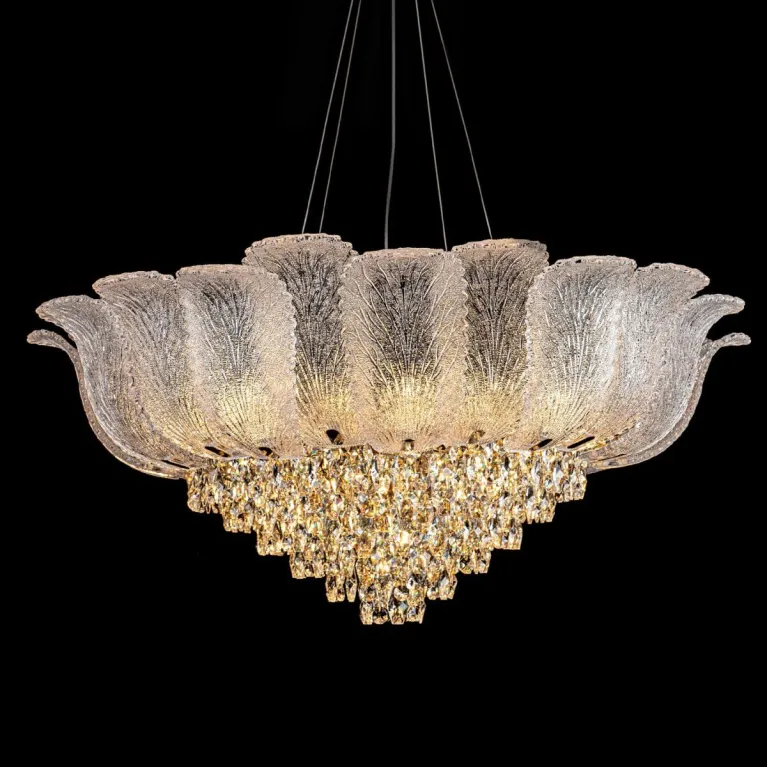 Преобладающий цвет плафонов: Прозрачный, арматуры: Золото; материал изготовления арматуры: Металл, размеры, мм: / высота 1500 / диаметр 1000. Общая мощность – 1000 Ватт, а максимальная площадь освещения до 22 м2. Основной тип ламп, предусмотренный производителем: Накаливания с цоколем E14. В зависимости от предпочтений можно использовать лампы теплового, холодного или нейтрального света, за исключением люстр с типом цоколя LED.