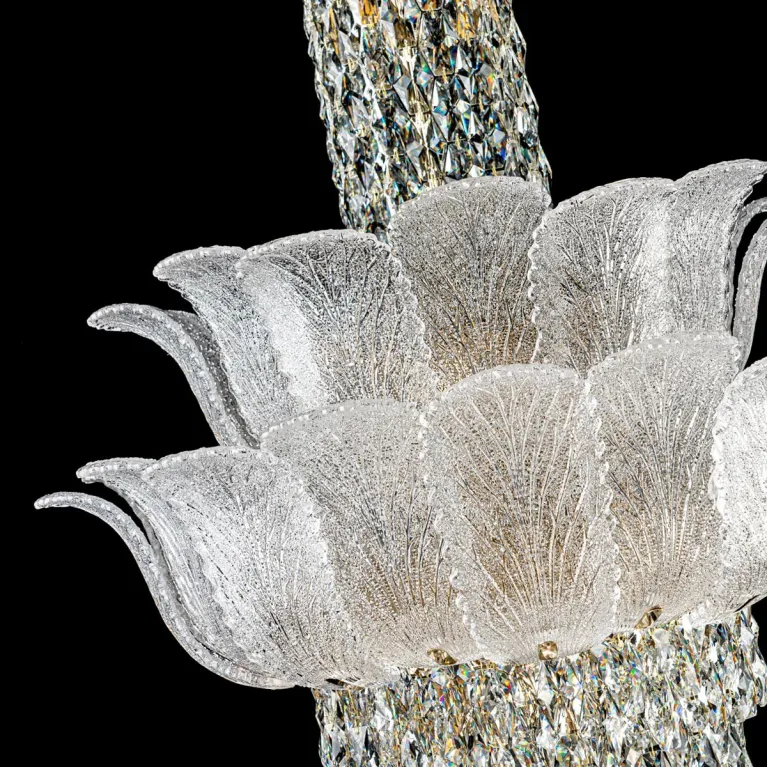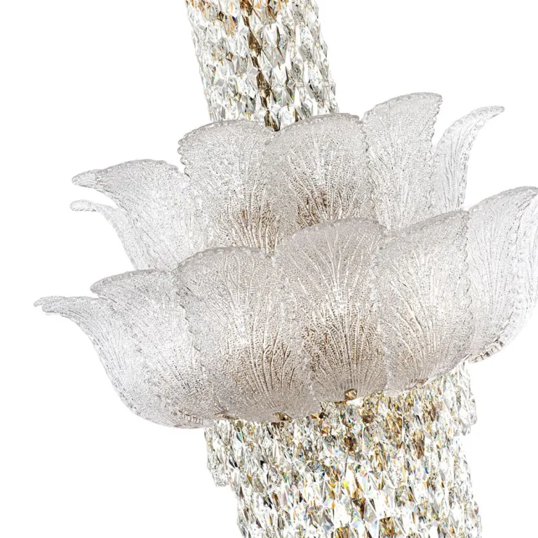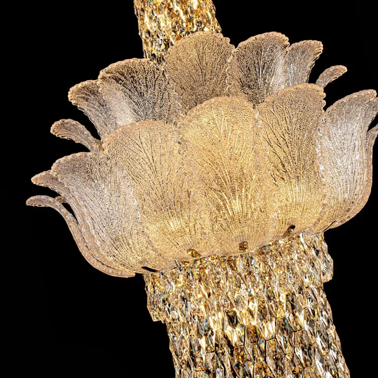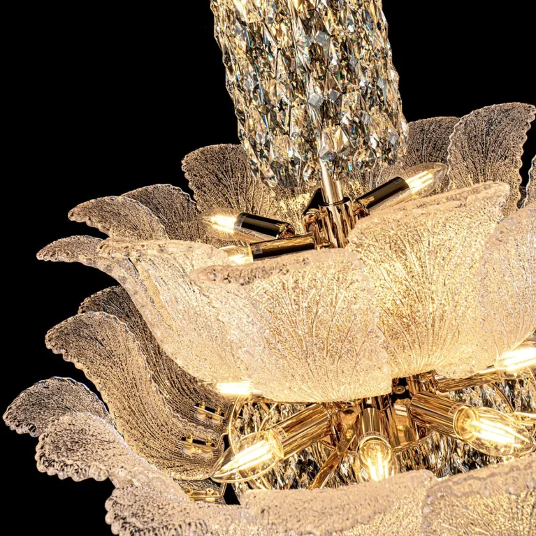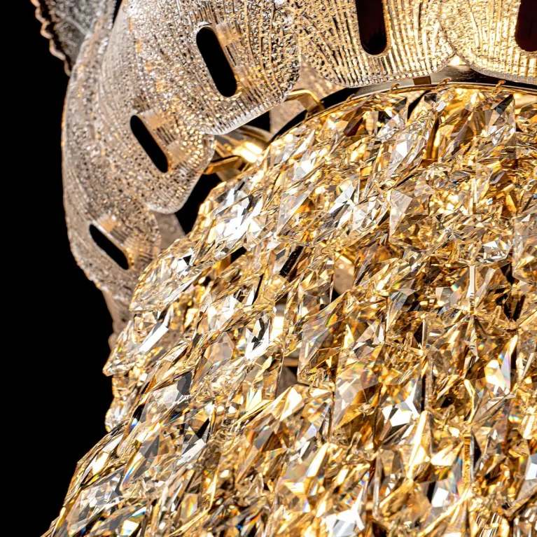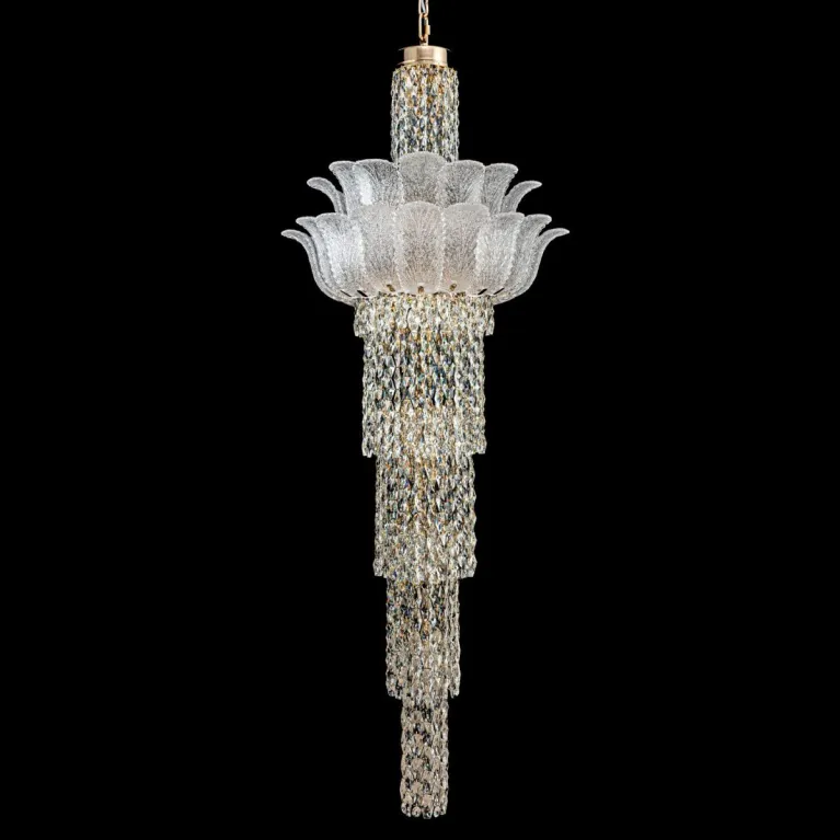 Преобладающий цвет плафонов: Прозрачный, арматуры: Золото; материал изготовления арматуры: Металл, размеры, мм: / высота 3040 / диаметр 670. Общая мощность – 1120 Ватт, а максимальная площадь освещения до 26 м2. Основной тип ламп, предусмотренный производителем: Накаливания с цоколем E14. В зависимости от предпочтений можно использовать лампы теплового, холодного или нейтрального света, за исключением люстр с типом цоколя LED.