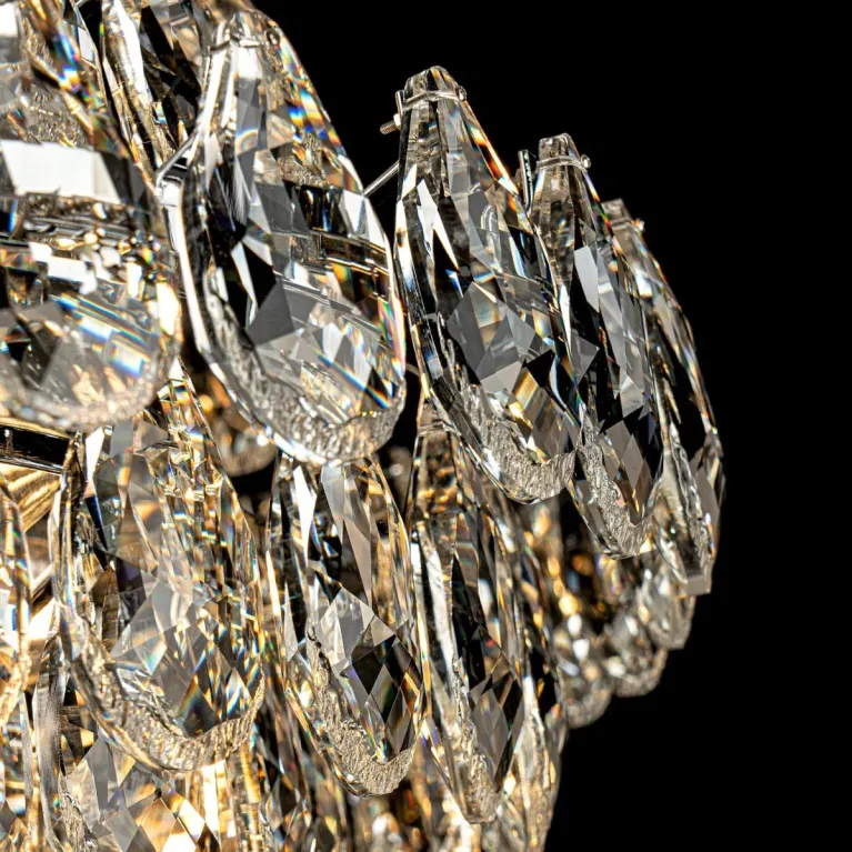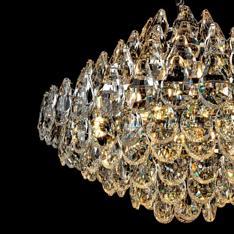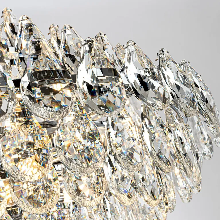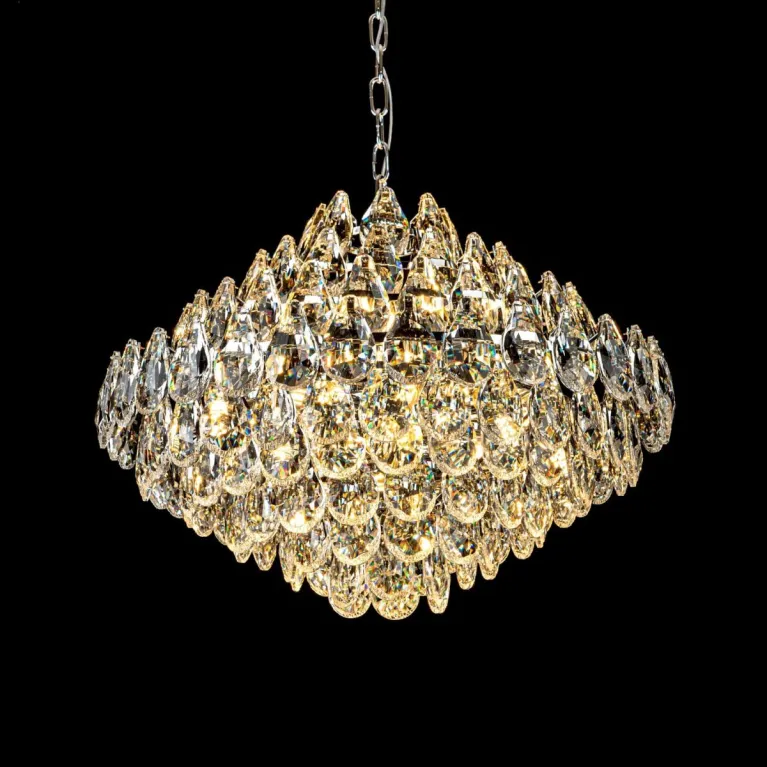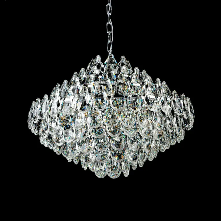 Преобладающий цвет плафонов: Прозрачный, арматуры: Хром; материал изготовления арматуры: Металл, размеры, мм: / высота 1200 / диаметр 600. Общая мощность – 640 Ватт, а максимальная площадь освещения до 20 м2. Основной тип ламп, предусмотренный производителем: Накаливания с цоколем E14. В зависимости от предпочтений можно использовать лампы теплового, холодного или нейтрального света, за исключением люстр с типом цоколя LED.