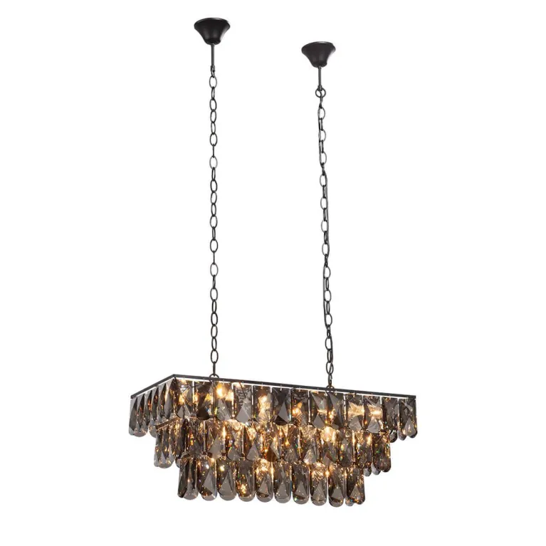Преобладающий цвет люстры: Черный, плафонов: Прозрачный, арматуры: Черный; материал изготовления арматуры: Металл, размеры, мм: длина 860 / ширина 395 / высота 1550 Общая мощность – 920 Ватт, а максимальная площадь освещения до 69 м2. Основной тип ламп, предусмотренный производителем: Накаливания с цоколем E14. В зависимости от предпочтений можно использовать лампы теплового, холодного или нейтрального света, за исключением люстр с типом цоколя LED.