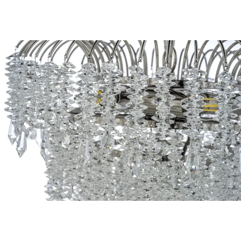 Преобладающий цвет плафонов: Прозрачный, арматуры: Никель; материал изготовления арматуры: Металл, размеры, мм: / высота 400 / диаметр 390. Общая мощность – 200 Ватт. Основной тип ламп, предусмотренный производителем: Накаливания с цоколем E14. В зависимости от предпочтений можно использовать лампы теплового, холодного или нейтрального света, за исключением люстр с типом цоколя LED.