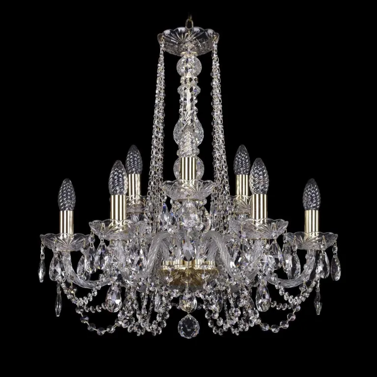 Преобладающий цвет люстры: Золотой, арматуры: Золото; материал изготовления арматуры: Металл, размеры, мм: / высота 580 / диаметр 600. Общая мощность – 360 Ватт. Основной тип ламп, предусмотренный производителем: Накаливания с цоколем E14. В зависимости от предпочтений можно использовать лампы теплового, холодного или нейтрального света, за исключением люстр с типом цоколя LED.