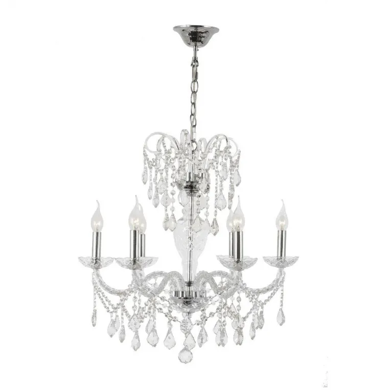 Корпус люстры выполнен из высококачественного металла с никелевым покрытием. Плафоны изготовлены из прочного и долговечного хрусталя, который прекрасно рассеивает свет и создает мягкое и приятное для глаз освещение. Люстра рассчитана на использование ламп накаливания мощностью до 60 Вт и подходит для всех типов потолков, включая подвесные и натяжные.