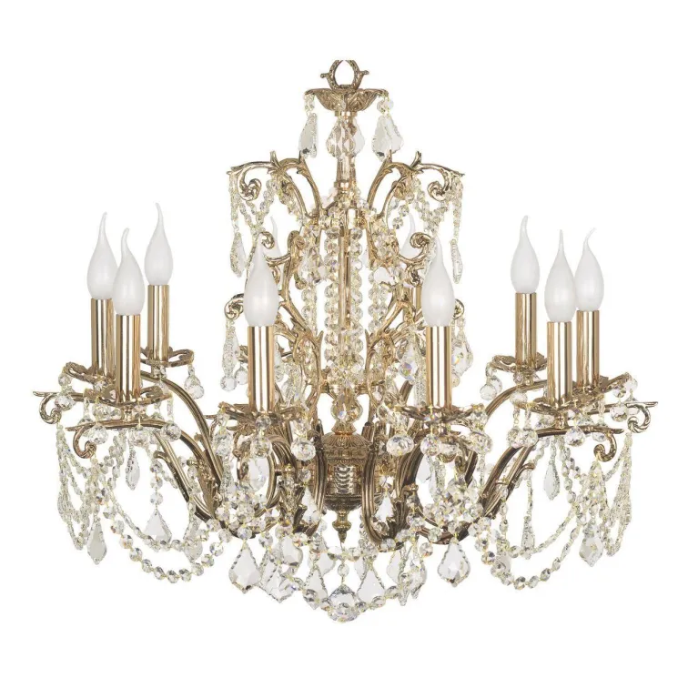 Преобладающий цвет люстры: Золотой, арматуры: Золото; материал изготовления арматуры: Металл, размеры, мм: / высота 620 / диаметр 800. Общая мощность – 400 Ватт, а максимальная площадь освещения до 22,2 м2. Основной тип ламп, предусмотренный производителем: Накаливания с цоколем E14. В зависимости от предпочтений можно использовать лампы теплового, холодного или нейтрального света, за исключением люстр с типом цоколя LED.