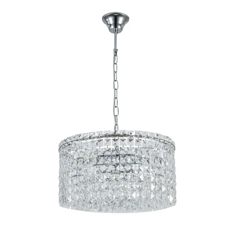 Преобладающий цвет плафонов: Прозрачный, арматуры: Хром; материал изготовления арматуры: Металл, размеры, мм: длина 400 / ширина 400 / высота 710 / диаметр 400. Общая мощность – 200 Ватт, а максимальная площадь освещения до 10 м2. Основной тип ламп, предусмотренный производителем: Накаливания с цоколем E14. В зависимости от предпочтений можно использовать лампы теплового, холодного или нейтрального света, за исключением люстр с типом цоколя LED.