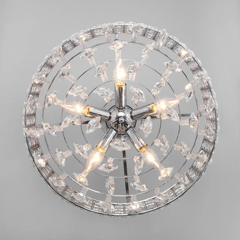 Преобладающий цвет люстры: Хром, плафонов: Прозрачный, арматуры: Хром; материал изготовления арматуры: Металл, размеры, мм: / высота 306 / диаметр 455. Общая мощность – 300 Ватт, а максимальная площадь освещения до 15 м2. Основной тип ламп, предусмотренный производителем: Накаливания с цоколем E14. В зависимости от предпочтений можно использовать лампы теплового, холодного или нейтрального света, за исключением люстр с типом цоколя LED.