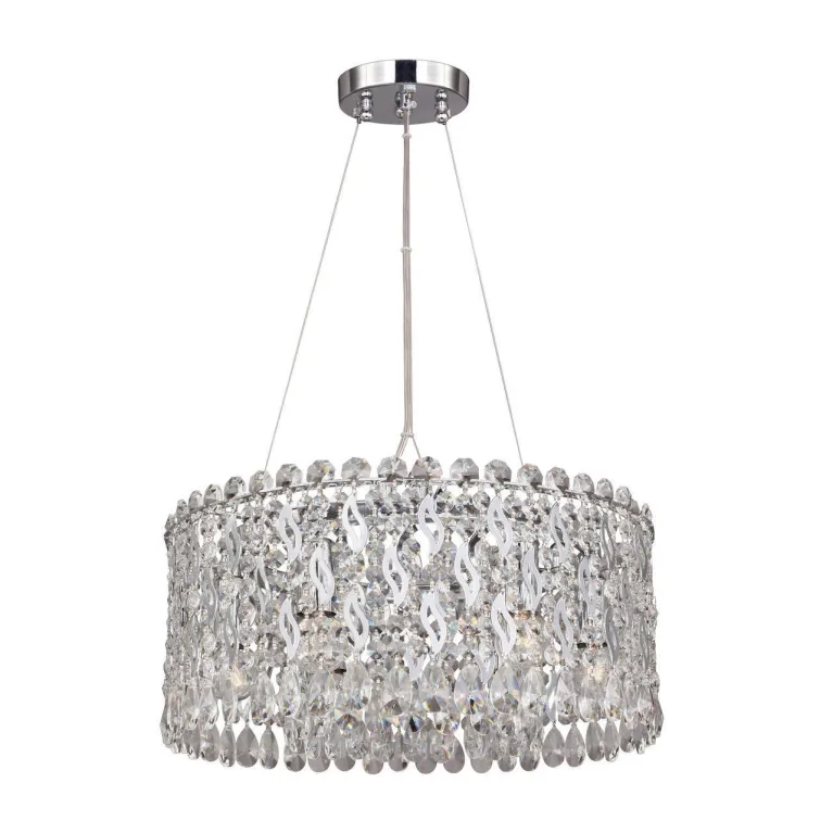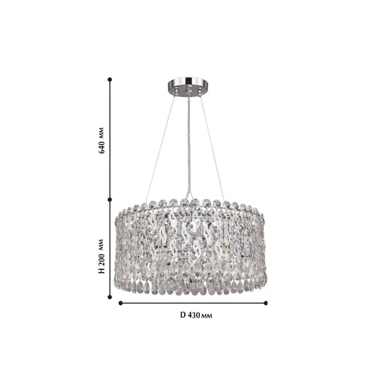 Преобладающий цвет люстры: Хром, плафонов: Прозрачный, арматуры: Хром; материал изготовления арматуры: Металл, размеры, мм: / высота 200 / диаметр 430. Общая мощность – 240 Ватт, а максимальная площадь освещения до 13,3 м2. Основной тип ламп, предусмотренный производителем: Накаливания с цоколем E14. В зависимости от предпочтений можно использовать лампы теплового, холодного или нейтрального света, за исключением люстр с типом цоколя LED.