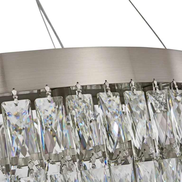 Преобладающий цвет плафонов: Прозрачный, арматуры: Никель; материал изготовления арматуры: Металл, размеры, мм: / высота 1760 / диаметр 800. Общая мощность – 640 Ватт, а максимальная площадь освещения до 48 м2. Основной тип ламп, предусмотренный производителем: Галогеновая с цоколем G9. В зависимости от предпочтений можно использовать лампы теплового, холодного или нейтрального света, за исключением люстр с типом цоколя LED.