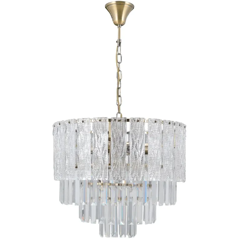 Преобладающий цвет плафонов: Прозрачный, арматуры: Бронза; материал изготовления арматуры: Металл, размеры, мм: / высота 450 / диаметр 480. Общая мощность – 360 Ватт, а максимальная площадь освещения до 54 м2. Основной тип ламп, предусмотренный производителем: Накаливания с цоколем E14. В зависимости от предпочтений можно использовать лампы теплового, холодного или нейтрального света, за исключением люстр с типом цоколя LED.