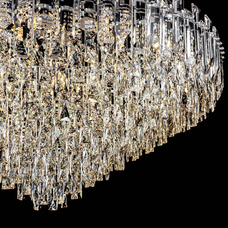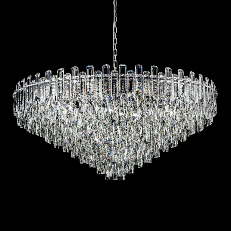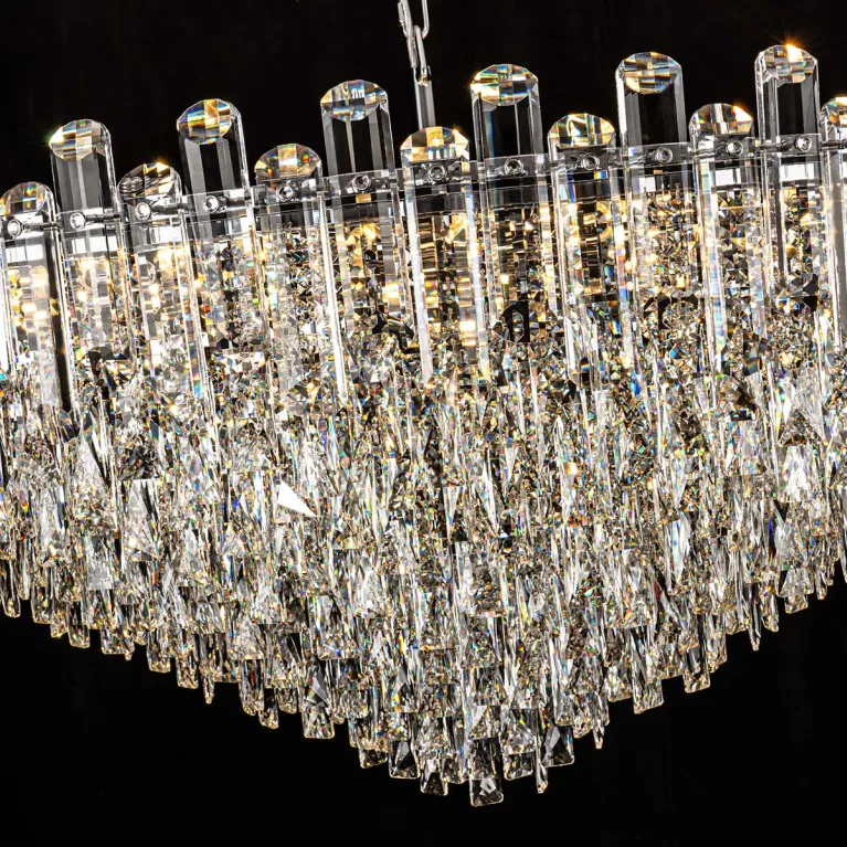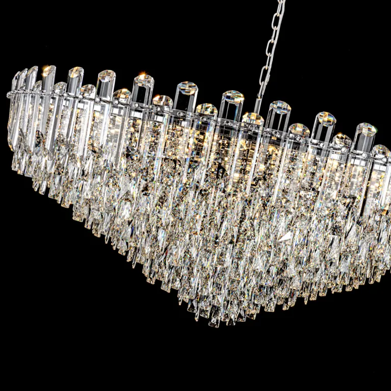 Преобладающий цвет плафонов: Прозрачный, арматуры: Хром; материал изготовления арматуры: Металл, размеры, мм: / высота 1160 / диаметр 1200. Общая мощность – 1280 Ватт, а максимальная площадь освещения до 20 м2. Основной тип ламп, предусмотренный производителем: Накаливания с цоколем E14. В зависимости от предпочтений можно использовать лампы теплового, холодного или нейтрального света, за исключением люстр с типом цоколя LED.