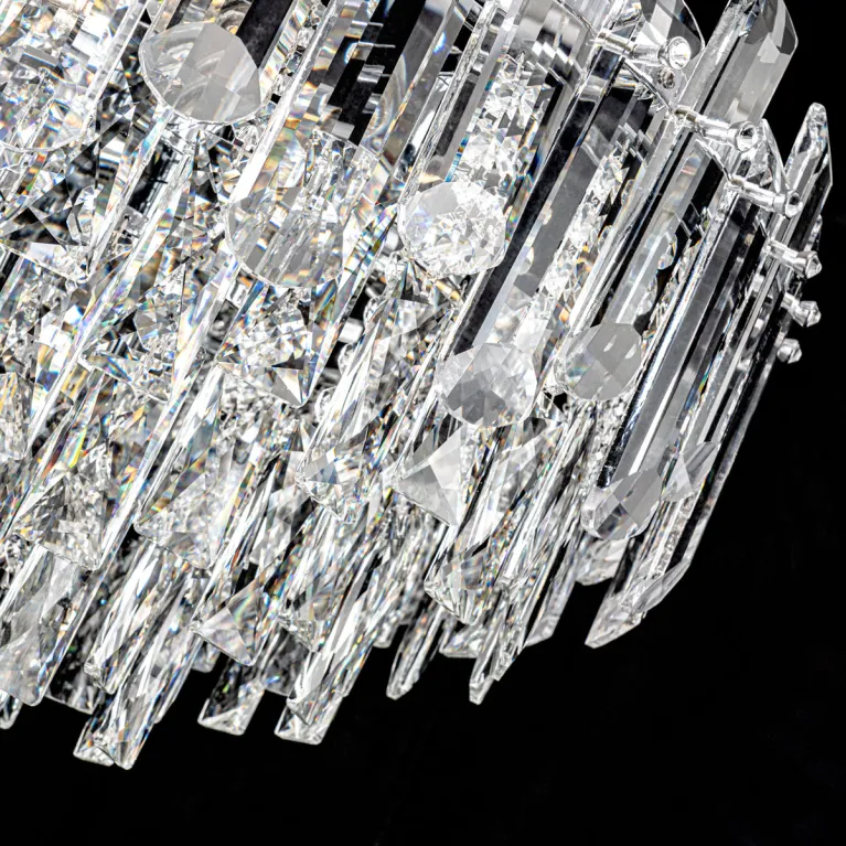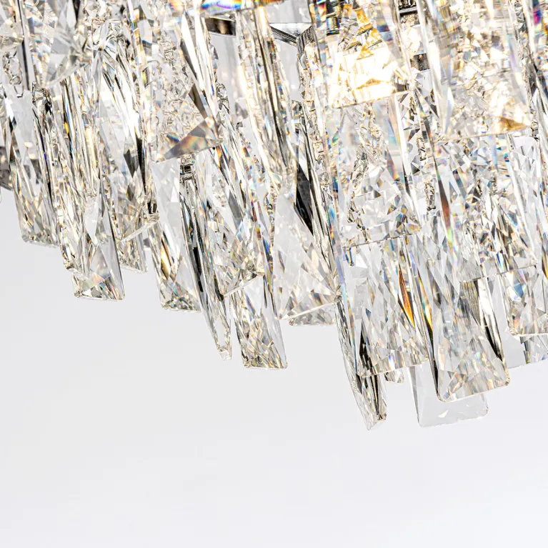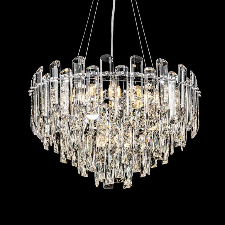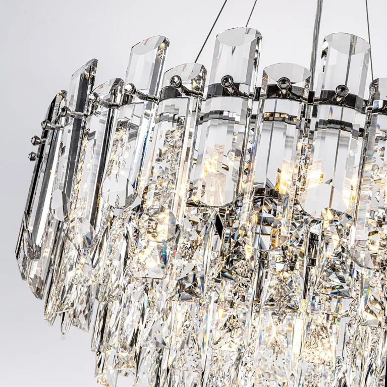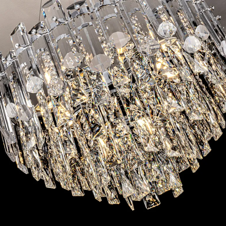 Преобладающий цвет плафонов: Прозрачный, арматуры: Хром; материал изготовления арматуры: Металл, размеры, мм: / высота 1370 / диаметр 500. Общая мощность – 400 Ватт, а максимальная площадь освещения до 17 м2. Основной тип ламп, предусмотренный производителем: Накаливания с цоколем E14. В зависимости от предпочтений можно использовать лампы теплового, холодного или нейтрального света, за исключением люстр с типом цоколя LED.