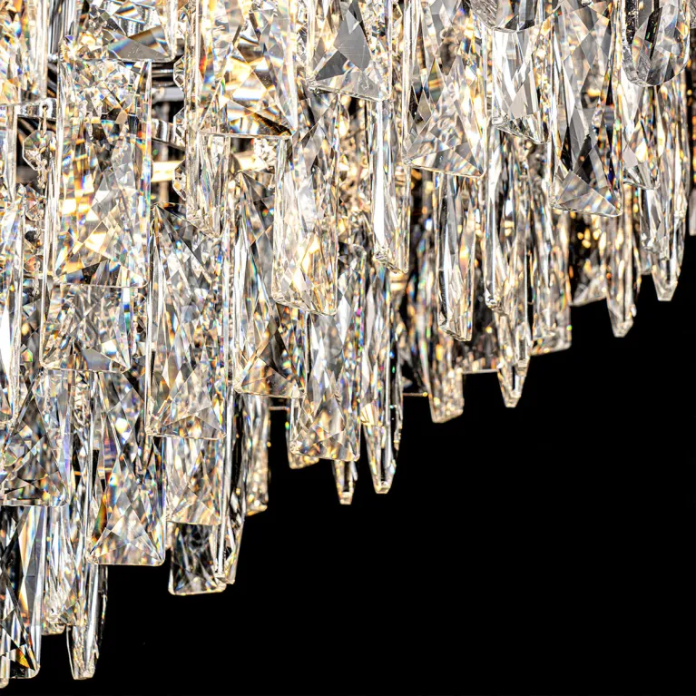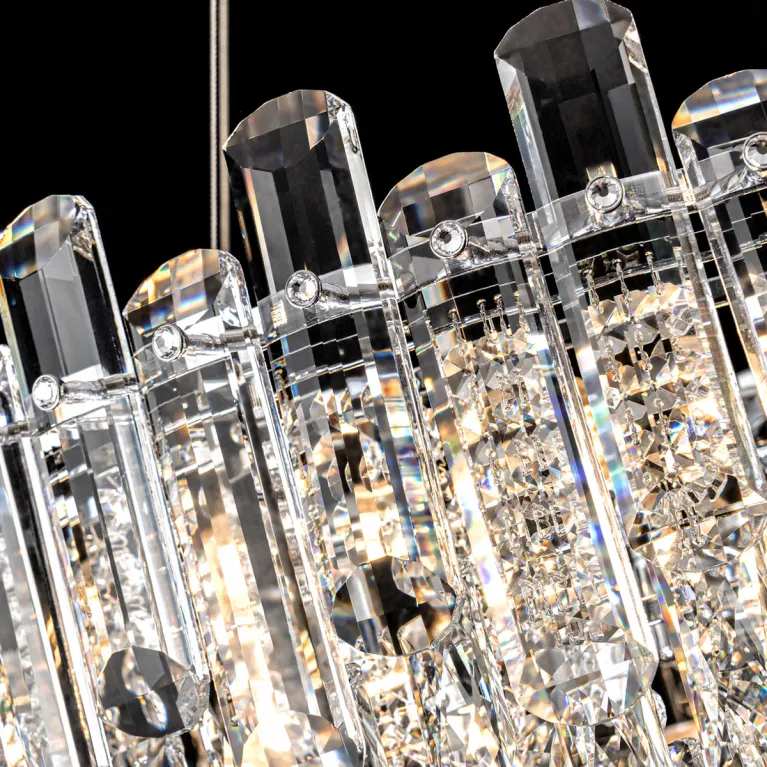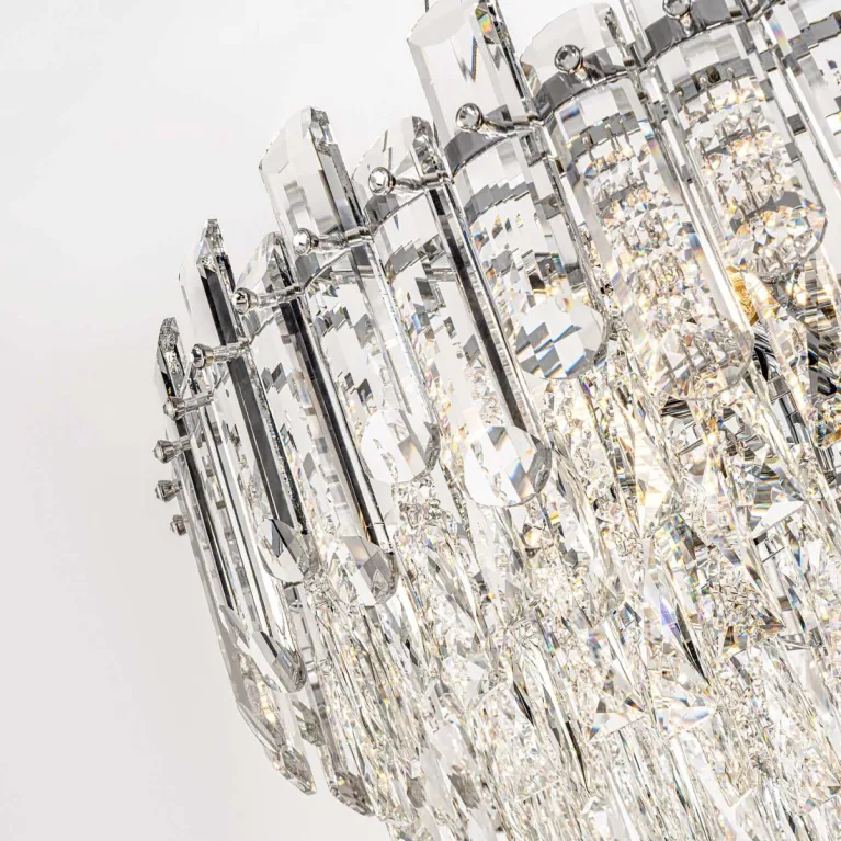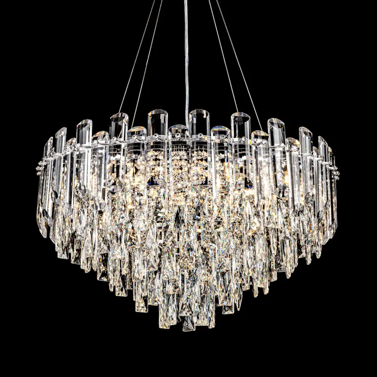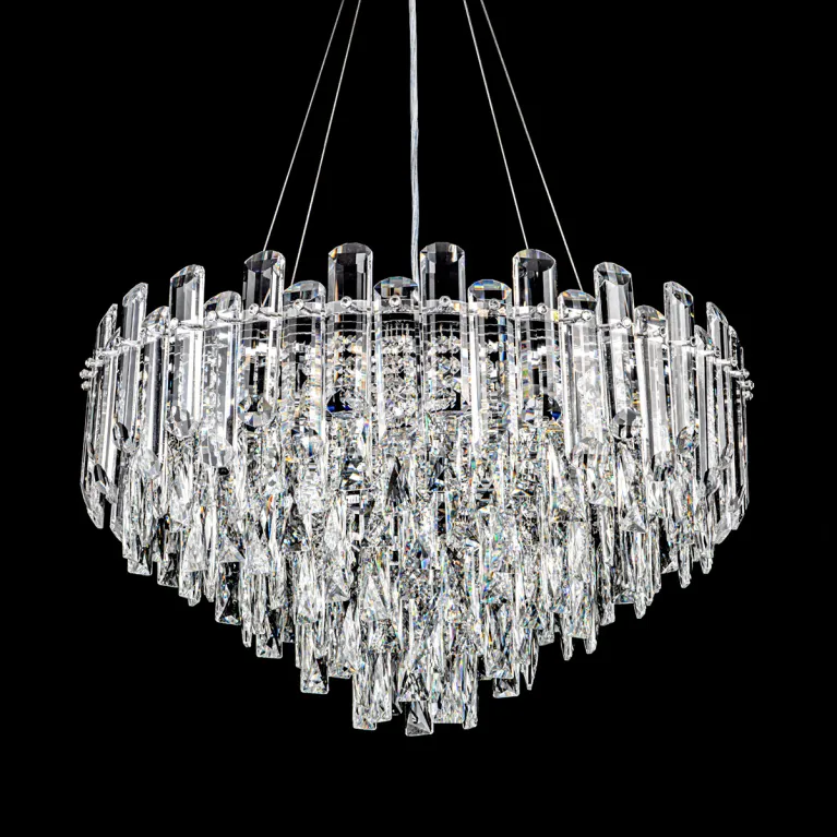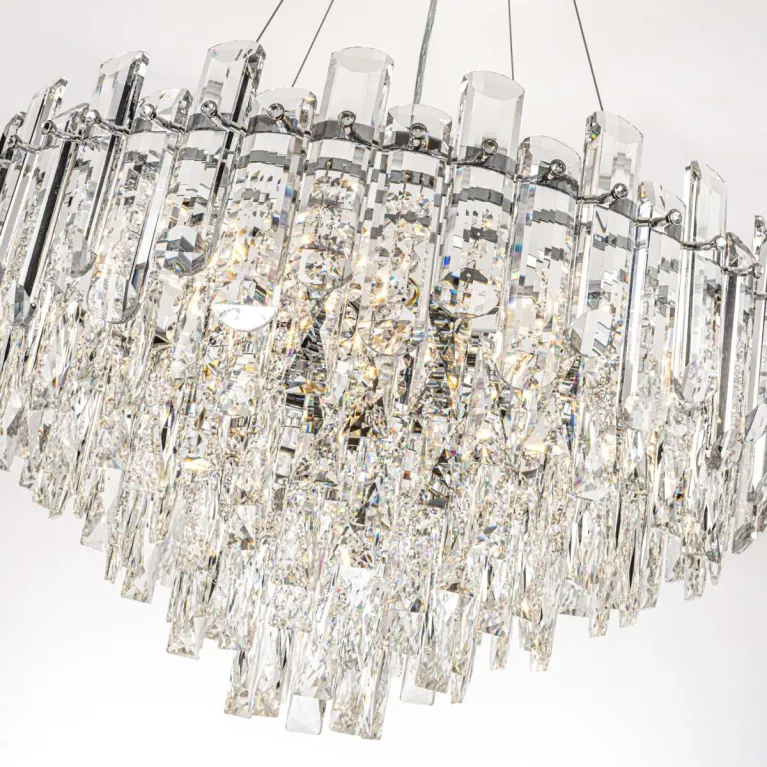 Преобладающий цвет плафонов: Прозрачный, арматуры: Хром; материал изготовления арматуры: Металл, размеры, мм: / высота 1370 / диаметр 600. Общая мощность – 480 Ватт, а максимальная площадь освещения до 17 м2. Основной тип ламп, предусмотренный производителем: Накаливания с цоколем E14. В зависимости от предпочтений можно использовать лампы теплового, холодного или нейтрального света, за исключением люстр с типом цоколя LED.