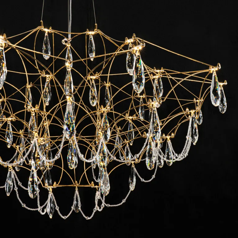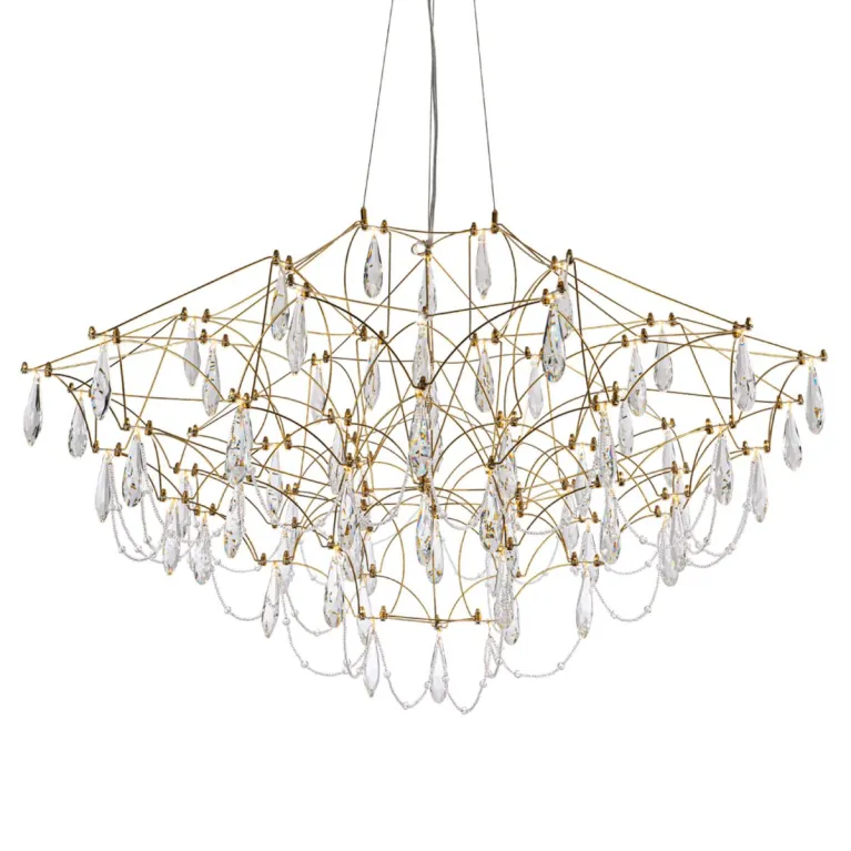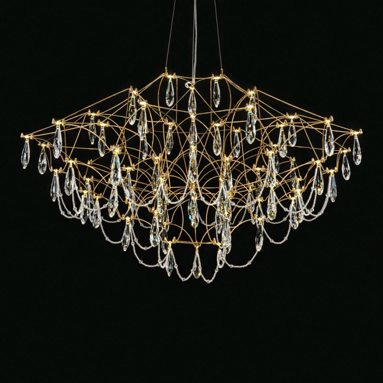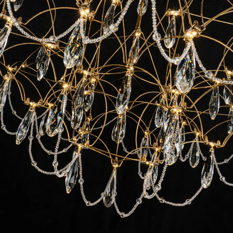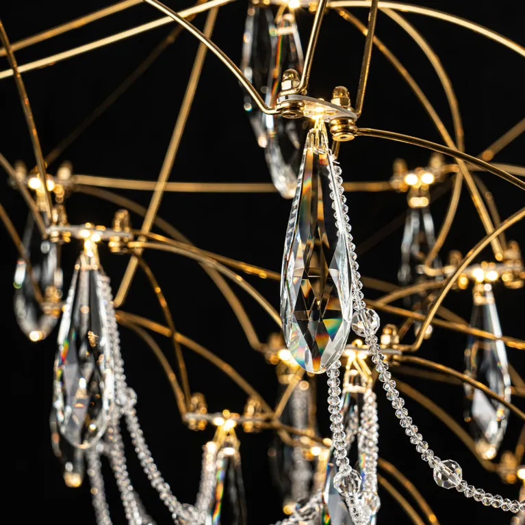 Преобладающий цвет плафонов: Прозрачный, арматуры: Латунь; материал изготовления арматуры: Металл, размеры, мм: / высота 600 / диаметр 1000. Общая мощность – 52 Ватт. Основной тип ламп, предусмотренный производителем: Светодиодная с цоколем LED. В зависимости от предпочтений можно использовать лампы теплового, холодного или нейтрального света, за исключением люстр с типом цоколя LED.