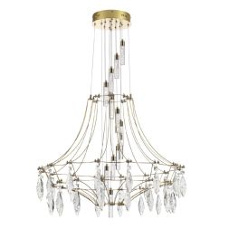 Преобладающий цвет плафонов: Прозрачный, арматуры: Золото; материал изготовления арматуры: Металл, размеры, мм: длина 1200 / ширина 500 / высота 350 Общая мощность – 1200 Ватт. Основной тип ламп, предусмотренный производителем: Галогеновая с цоколем G9. В зависимости от предпочтений можно использовать лампы теплового, холодного или нейтрального света, за исключением люстр с типом цоколя LED.