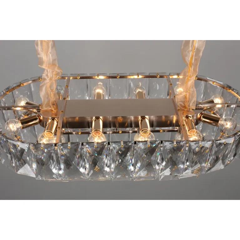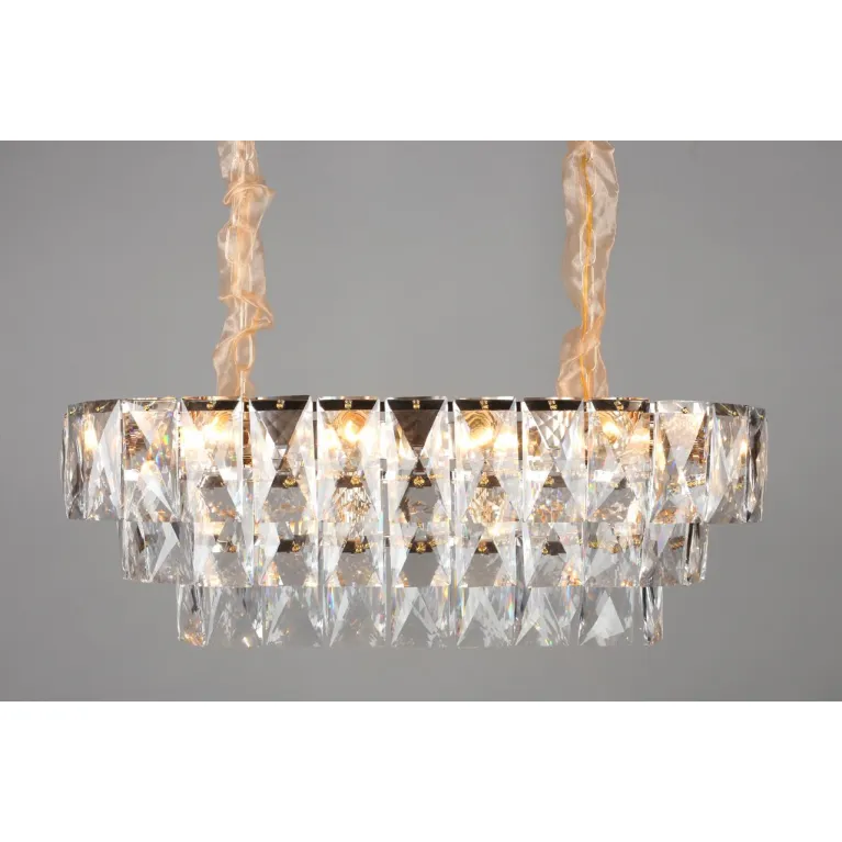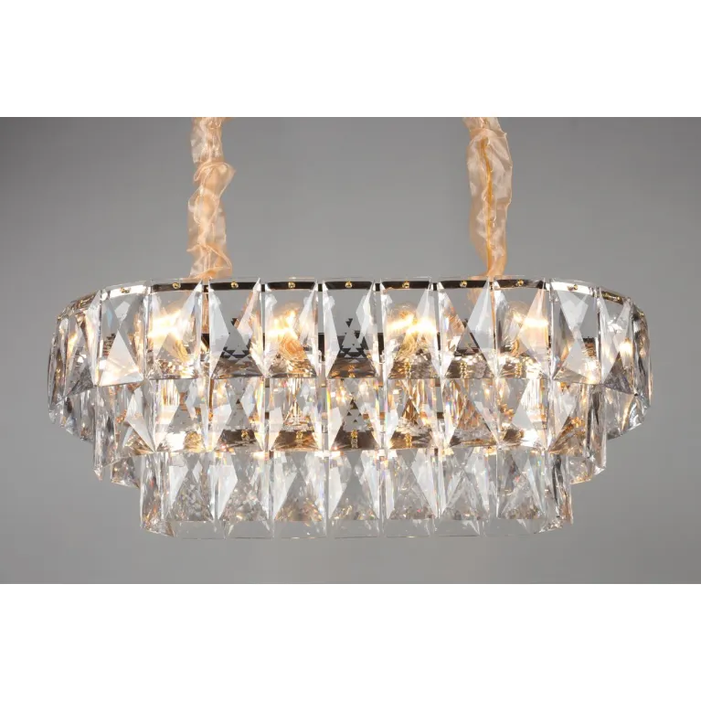 Люстра выполнена из прочного металла и хрусталя высокого качества. Её современный дизайн и изящные линии делают её универсальной для интерьеров в стиле модерн, минимализм или хай-тек. Основание люстры имеет эффектное хромированное покрытие, которое придаёт изделию современный и стильный вид.