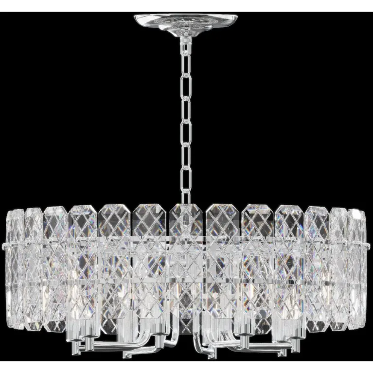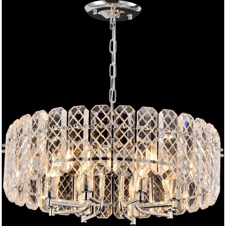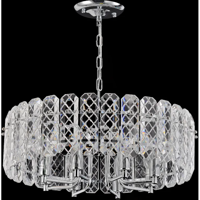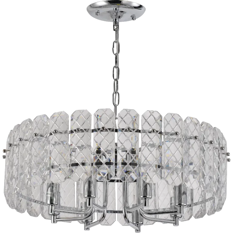 Преобладающий цвет плафонов: Прозрачный, арматуры: Хром; материал изготовления арматуры: Металл, размеры, мм: / высота 490 / диаметр 530. Общая мощность – 320 Ватт, а максимальная площадь освещения до 24 м2. Основной тип ламп, предусмотренный производителем: Накаливания с цоколем E14. В зависимости от предпочтений можно использовать лампы теплового, холодного или нейтрального света, за исключением люстр с типом цоколя LED.