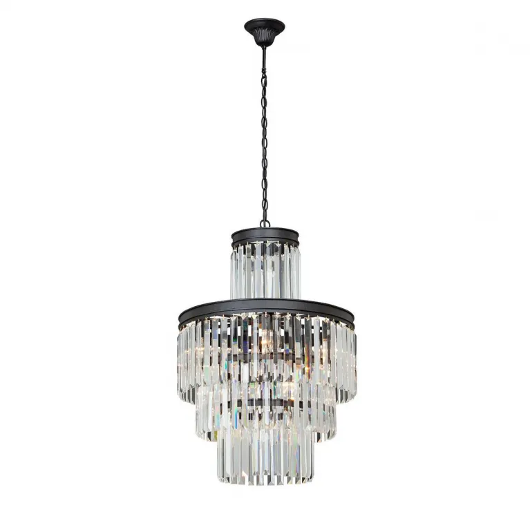 Преобладающий цвет люстры: Черный, плафонов: Прозрачный, арматуры: Черный; материал изготовления арматуры: Металл, размеры, мм: / высота 1370 / диаметр 510. Общая мощность – 600 Ватт, а максимальная площадь освещения до 30 м2. Основной тип ламп, предусмотренный производителем: Накаливания с цоколем E14. В зависимости от предпочтений можно использовать лампы теплового, холодного или нейтрального света, за исключением люстр с типом цоколя LED.
