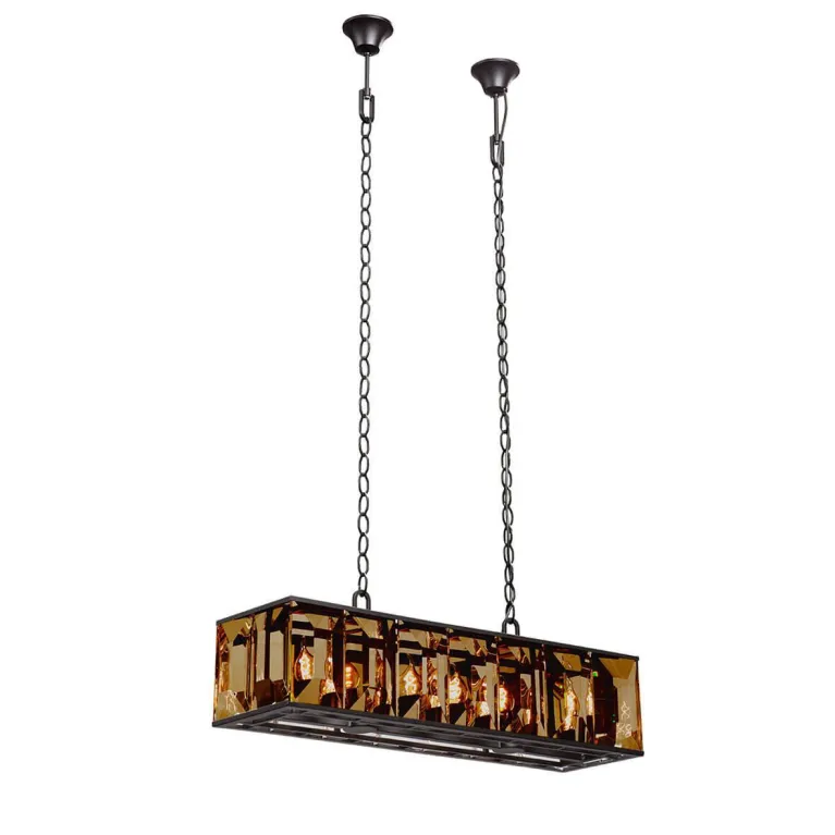 Преобладающий цвет люстры: Черный, плафонов: Прозрачный, арматуры: Черный; материал изготовления арматуры: Металл, размеры, мм: длина 906 / ширина 265 / высота 1500 Общая мощность – 420 Ватт, а максимальная площадь освещения до 21 м2. Основной тип ламп, предусмотренный производителем: Накаливания с цоколем E14. В зависимости от предпочтений можно использовать лампы теплового, холодного или нейтрального света, за исключением люстр с типом цоколя LED.