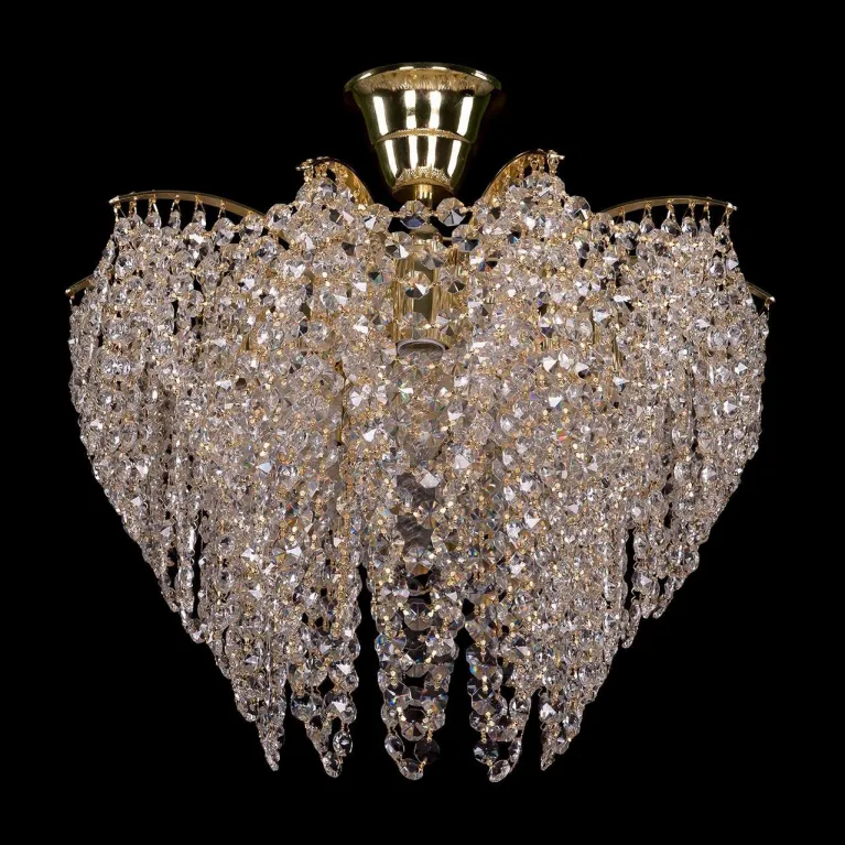 Люстра выполнена из высококачественного хрусталя и металла, что обеспечивает её долговечность и эстетичный внешний вид. Основание светильника изготовлено в элегантном золотом цвете, который придаст вашему интерьеру нотки роскоши и утонченности.