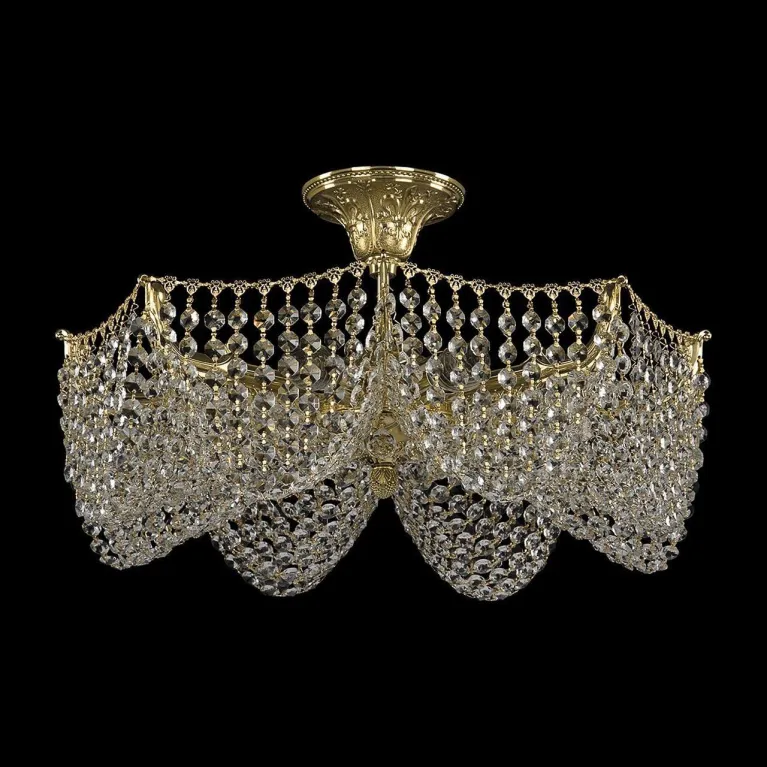 Изготовленная из прочного металла и высококачественного хрусталя, эта люстра отличается не только изысканным внешним видом, но и высоким качеством исполнения. Основание светильника выполнено в элегантном золотом цвете, что добавляет роскоши и утонченности вашему интерьеру.