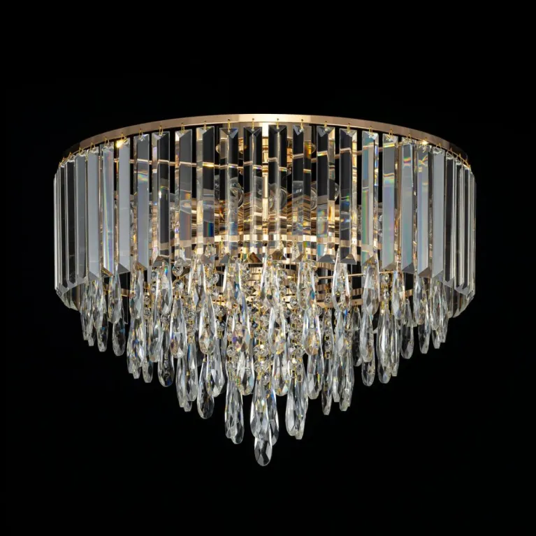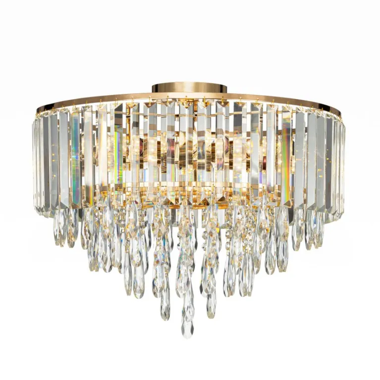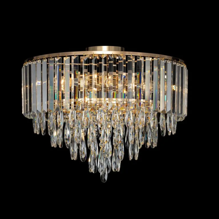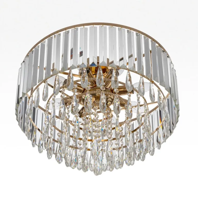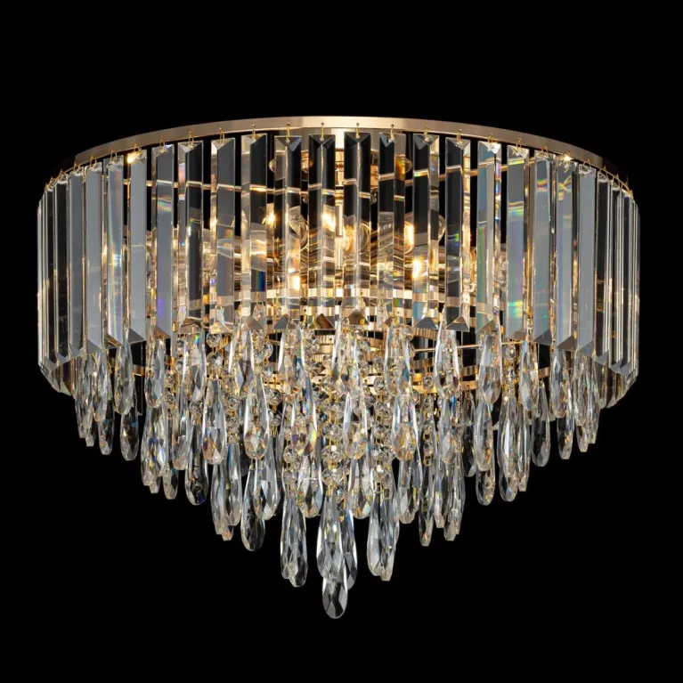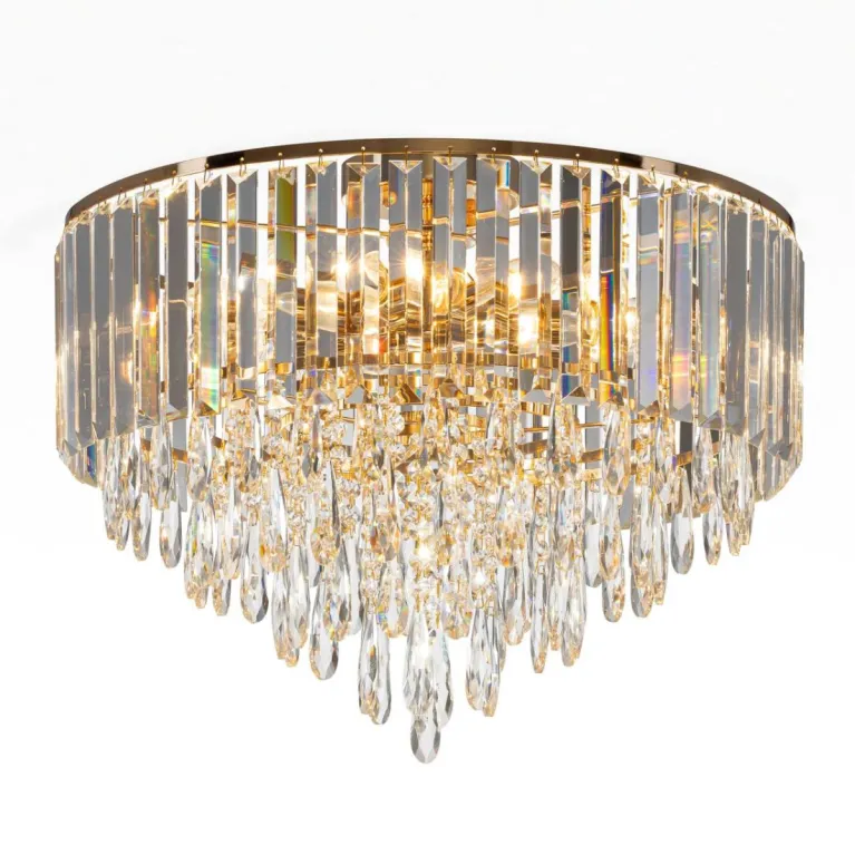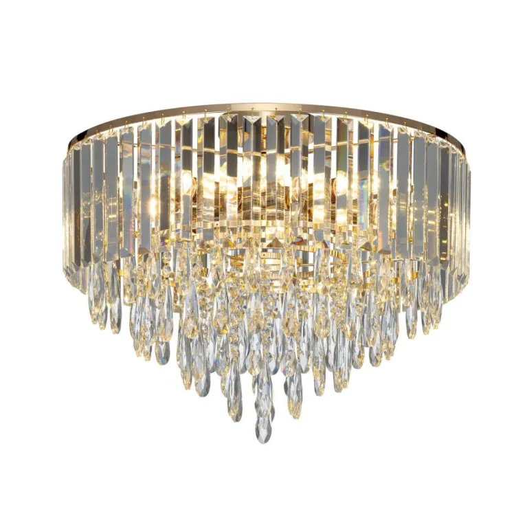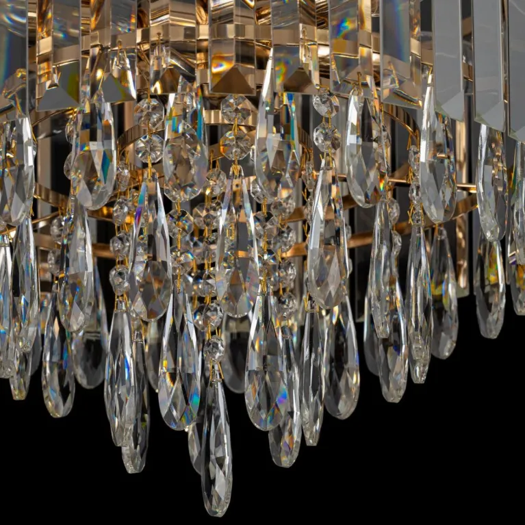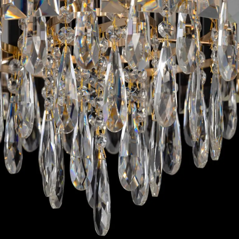 Преобладающий цвет плафонов: Прозрачный, арматуры: Золото; материал изготовления арматуры: Металл, размеры, мм: / высота 400 / диаметр 490. Общая мощность – 320 Ватт. Основной тип ламп, предусмотренный производителем: Накаливания с цоколем E14. В зависимости от предпочтений можно использовать лампы теплового, холодного или нейтрального света, за исключением люстр с типом цоколя LED.