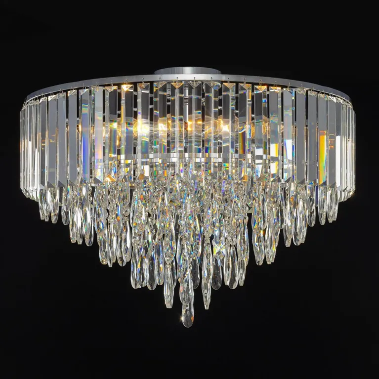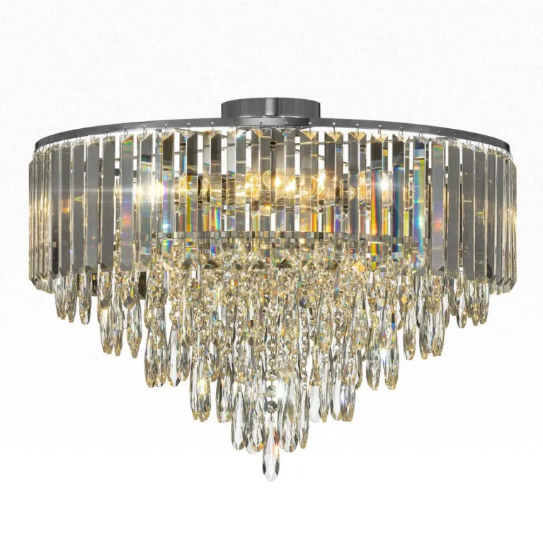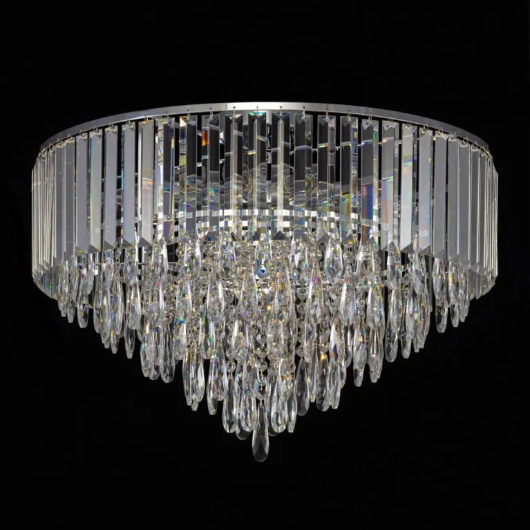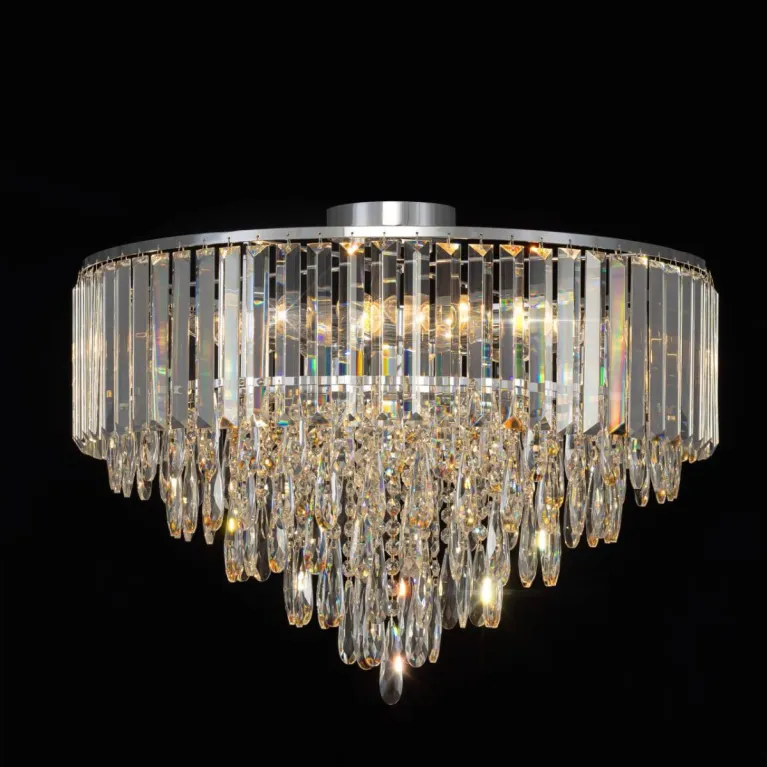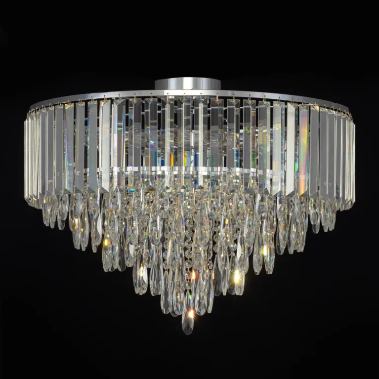 Преобладающий цвет плафонов: Прозрачный, арматуры: Хром; материал изготовления арматуры: Металл, размеры, мм: / высота 440 / диаметр 590. Общая мощность – 400 Ватт. Основной тип ламп, предусмотренный производителем: Накаливания с цоколем E14. В зависимости от предпочтений можно использовать лампы теплового, холодного или нейтрального света, за исключением люстр с типом цоколя LED.