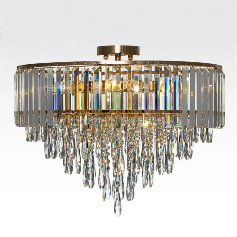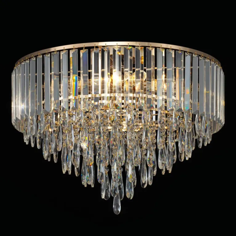 Преобладающий цвет плафонов: Прозрачный, арматуры: Золото; материал изготовления арматуры: Металл, размеры, мм: / высота 440 / диаметр 590. Общая мощность – 400 Ватт. Основной тип ламп, предусмотренный производителем: Накаливания с цоколем E14. В зависимости от предпочтений можно использовать лампы теплового, холодного или нейтрального света, за исключением люстр с типом цоколя LED.