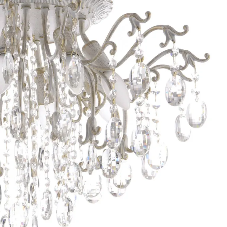 Люстра изготовлена из прочного металла и хрусталя, который придает ей неповторимый блеск и утончённость. Основание светильника выполнено в черном цвете, что добавляет ему строгости и стиля. Плафоны изготовлены из белого матового стекла, благодаря чему обеспечивается мягкое и равномерное рассеивание света.