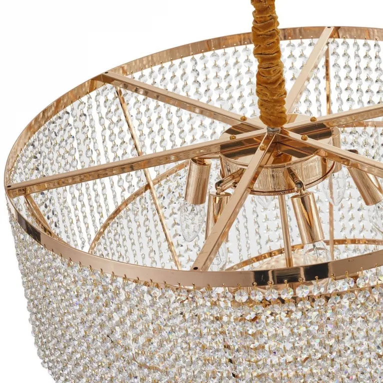 Люстра состоит из десяти ламп, что обеспечивает яркое и равномерное освещение. Она изготовлена из прочного металла и имеет стильное матовое золото покрытие, которое придает ей эксклюзивный вид. Основание диаметром 900 мм позволяет люстре гармонично вписаться в интерьер и создать уютную атмосферу.