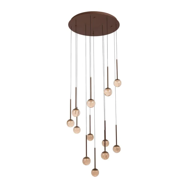 Преобладающий цвет плафонов: Янтарный, арматуры: Кофейный; материал изготовления арматуры: Металл, размеры, мм: / высота 1693 / диаметр 699. Общая мощность – 84 Ватт. Основной тип ламп, предусмотренный производителем: Светодиодная с цоколем LED. В зависимости от предпочтений можно использовать лампы теплового, холодного или нейтрального света, за исключением люстр с типом цоколя LED.