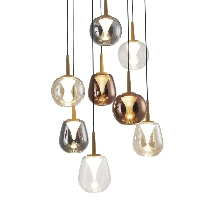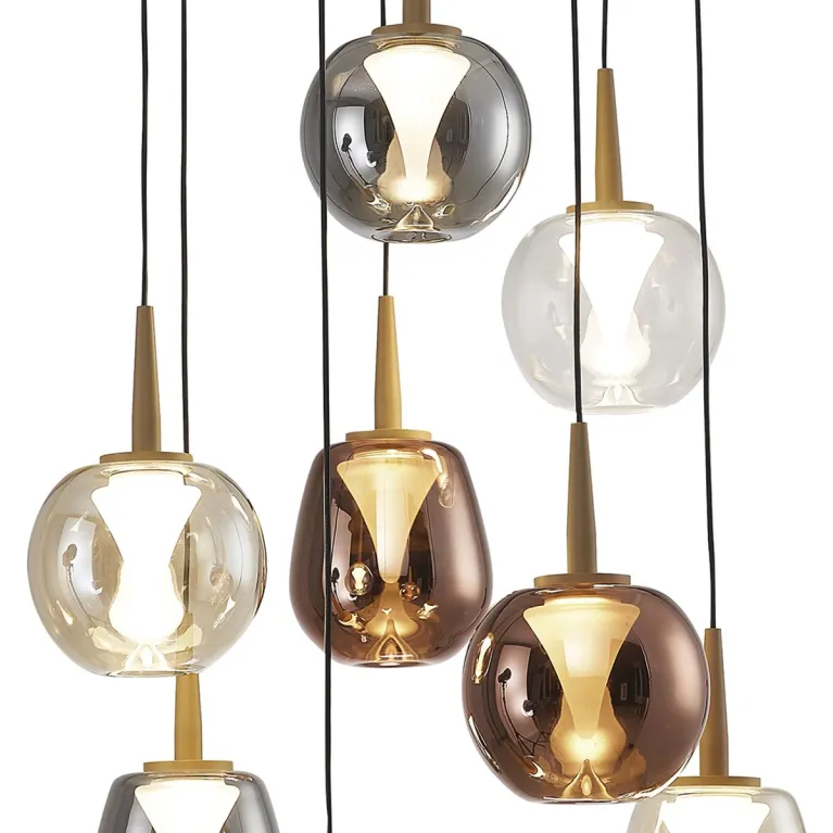 Преобладающий цвет плафонов: Разноцветный, арматуры: Золото; материал изготовления арматуры: Металл, размеры, мм: / высота 2125 / диаметр 400. Общая мощность – 40 Ватт. Основной тип ламп, предусмотренный производителем: Светодиодная с цоколем LED. В зависимости от предпочтений можно использовать лампы теплового, холодного или нейтрального света, за исключением люстр с типом цоколя LED.