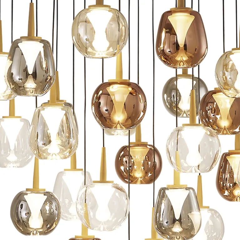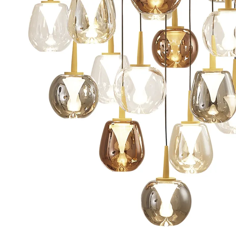 Преобладающий цвет плафонов: Разноцветный, арматуры: Золото; материал изготовления арматуры: Металл, размеры, мм: / высота 2125 / диаметр 750. Общая мощность – 120 Ватт. Основной тип ламп, предусмотренный производителем: Светодиодная с цоколем LED. В зависимости от предпочтений можно использовать лампы теплового, холодного или нейтрального света, за исключением люстр с типом цоколя LED.