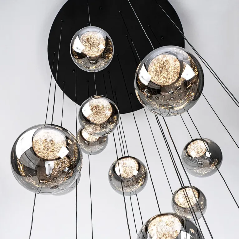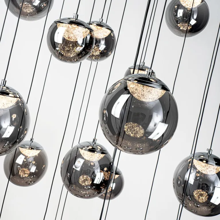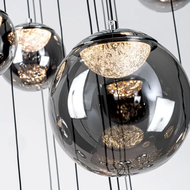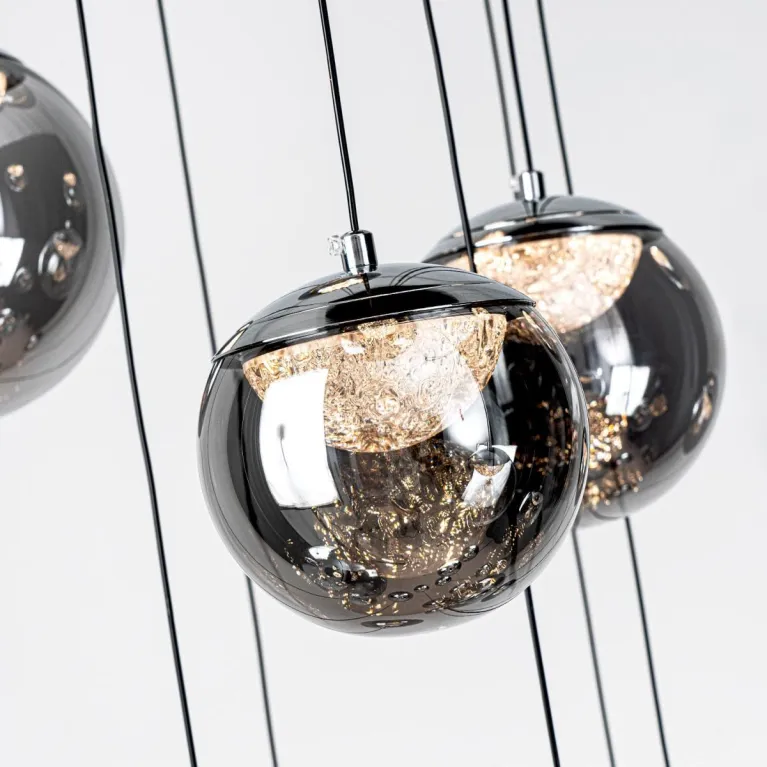 Преобладающий цвет плафонов: Дымчатый, арматуры: Черный; материал изготовления арматуры: Металл, размеры, мм: / высота 3000 / диаметр 800. Общая мощность – 175 Ватт. Основной тип ламп, предусмотренный производителем: Светодиодная с цоколем LED. В зависимости от предпочтений можно использовать лампы теплового, холодного или нейтрального света, за исключением люстр с типом цоколя LED.