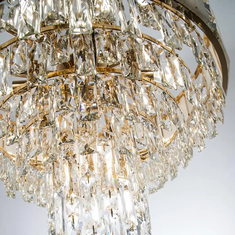 Преобладающий цвет плафонов: Прозрачный, арматуры: Золото; материал изготовления арматуры: Металл, размеры, мм: / высота 1500 / диаметр 560. Общая мощность – 800 Ватт, а максимальная площадь освещения до 22 м2. Основной тип ламп, предусмотренный производителем: Накаливания с цоколем E14. В зависимости от предпочтений можно использовать лампы теплового, холодного или нейтрального света, за исключением люстр с типом цоколя LED.