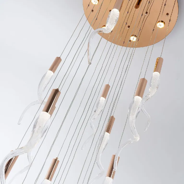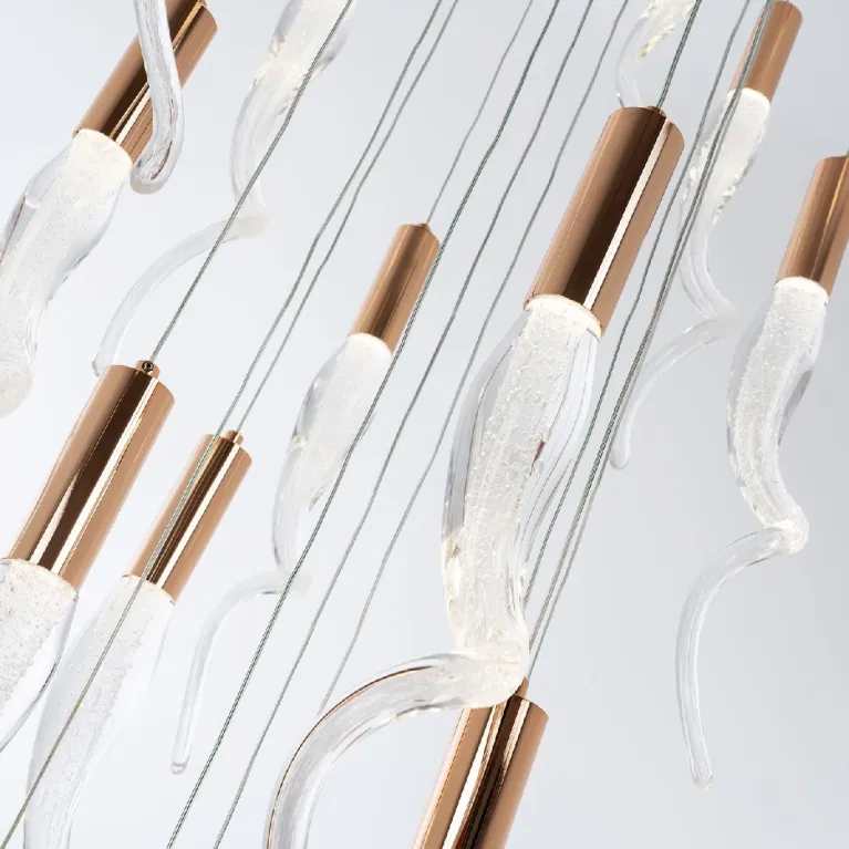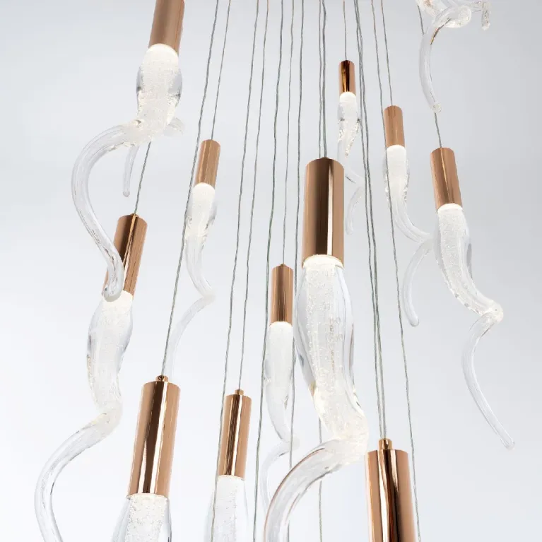 Преобладающий цвет плафонов: Прозрачный, арматуры: Золото; материал изготовления арматуры: Металл, размеры, мм: / высота 2600 / диаметр 600. Общая мощность – 135 Ватт. Основной тип ламп, предусмотренный производителем: Светодиодная с цоколем LED. В зависимости от предпочтений можно использовать лампы теплового, холодного или нейтрального света, за исключением люстр с типом цоколя LED.