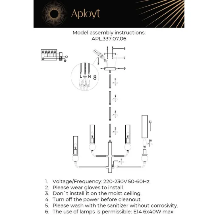 Преобладающий цвет плафонов: Прозрачный, арматуры: Латунь; материал изготовления арматуры: Металл, размеры, мм: / высота 1000 / диаметр 800. Общая мощность – 240 Ватт. Основной тип ламп, предусмотренный производителем: Накаливания с цоколем E14. В зависимости от предпочтений можно использовать лампы теплового, холодного или нейтрального света, за исключением люстр с типом цоколя LED.