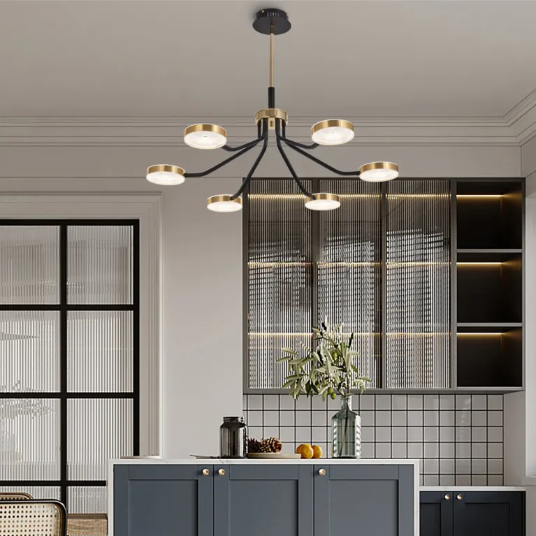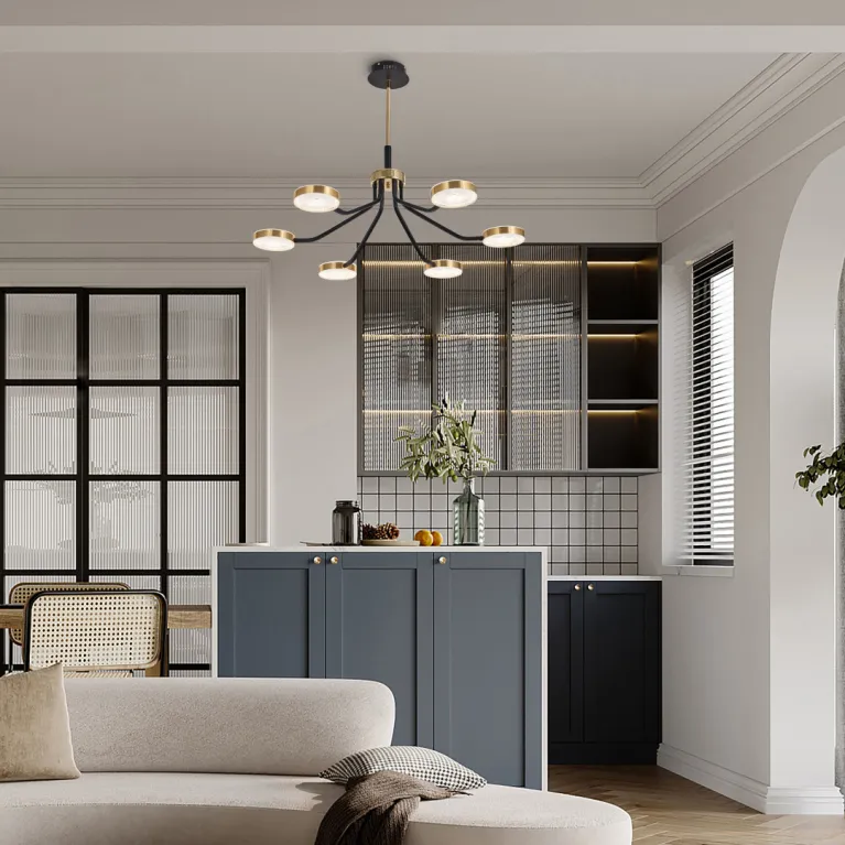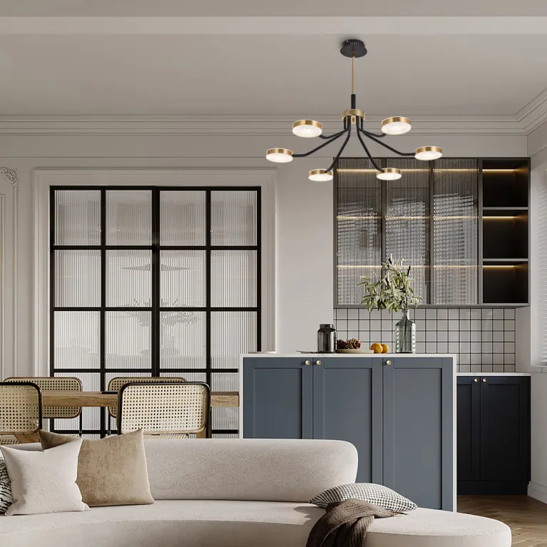 Преобладающий цвет плафонов: Золото, арматуры: Черный; материал изготовления арматуры: Металл, размеры, мм: длина 720 / высота 720 / диаметр 870. Общая мощность – 108 Ватт. Основной тип ламп, предусмотренный производителем: Светодиодная с цоколем LED. В зависимости от предпочтений можно использовать лампы теплового, холодного или нейтрального света, за исключением люстр с типом цоколя LED.