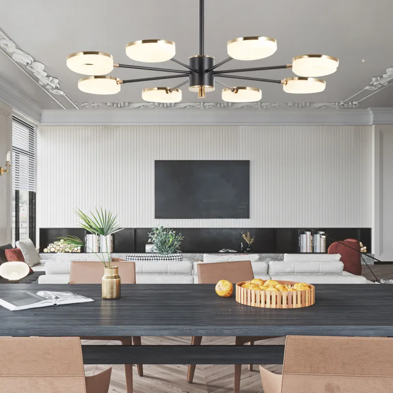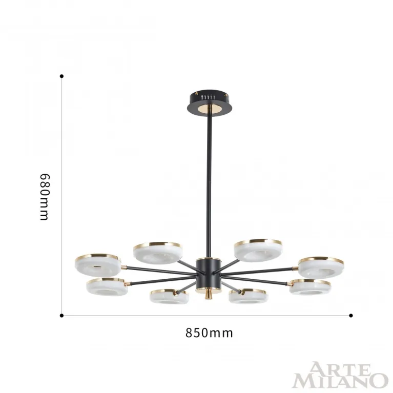 Преобладающий цвет плафонов: Золото, арматуры: Черный; материал изготовления арматуры: Металл, размеры, мм: длина 680 / высота 680 / диаметр 850. Общая мощность – 145 Ватт. Основной тип ламп, предусмотренный производителем: Светодиодная с цоколем LED. В зависимости от предпочтений можно использовать лампы теплового, холодного или нейтрального света, за исключением люстр с типом цоколя LED.
