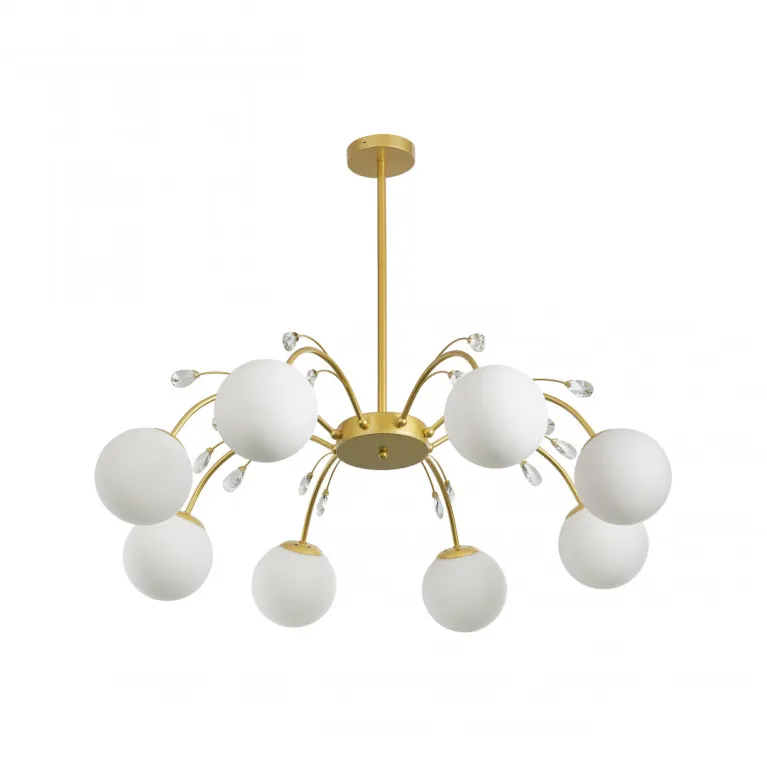 Преобладающий цвет плафонов: Белый, арматуры: Золото; материал изготовления арматуры: Металл, размеры, мм: длина 550 / высота 550 / диаметр 900. Общая мощность – 320 Ватт. Основной тип ламп, предусмотренный производителем: Накаливания с цоколем E27. В зависимости от предпочтений можно использовать лампы теплового, холодного или нейтрального света, за исключением люстр с типом цоколя LED.