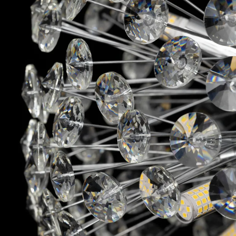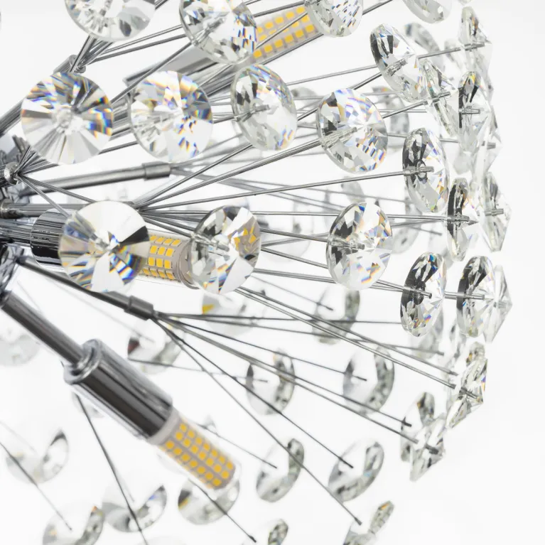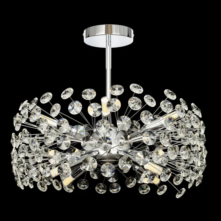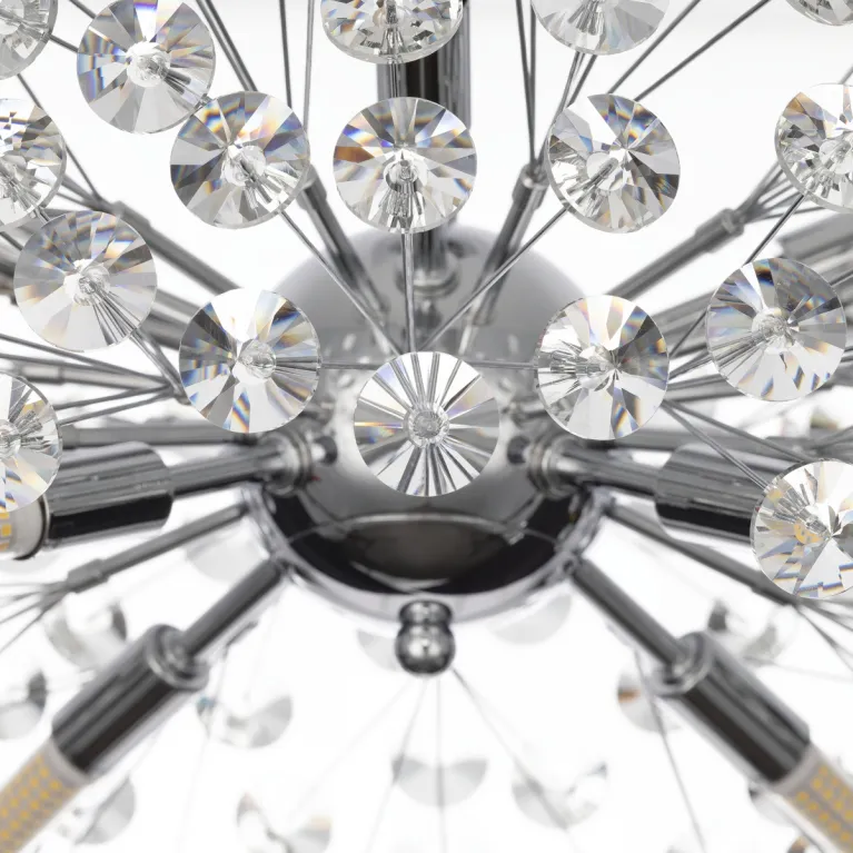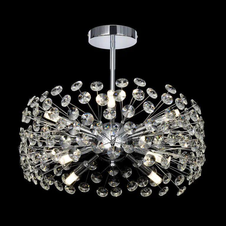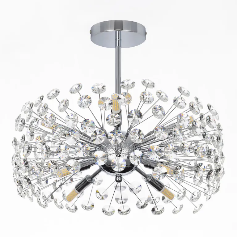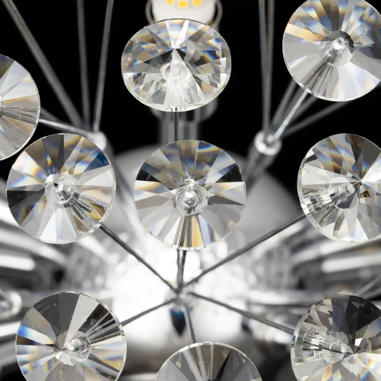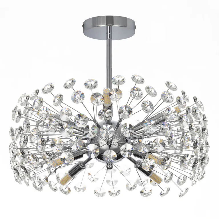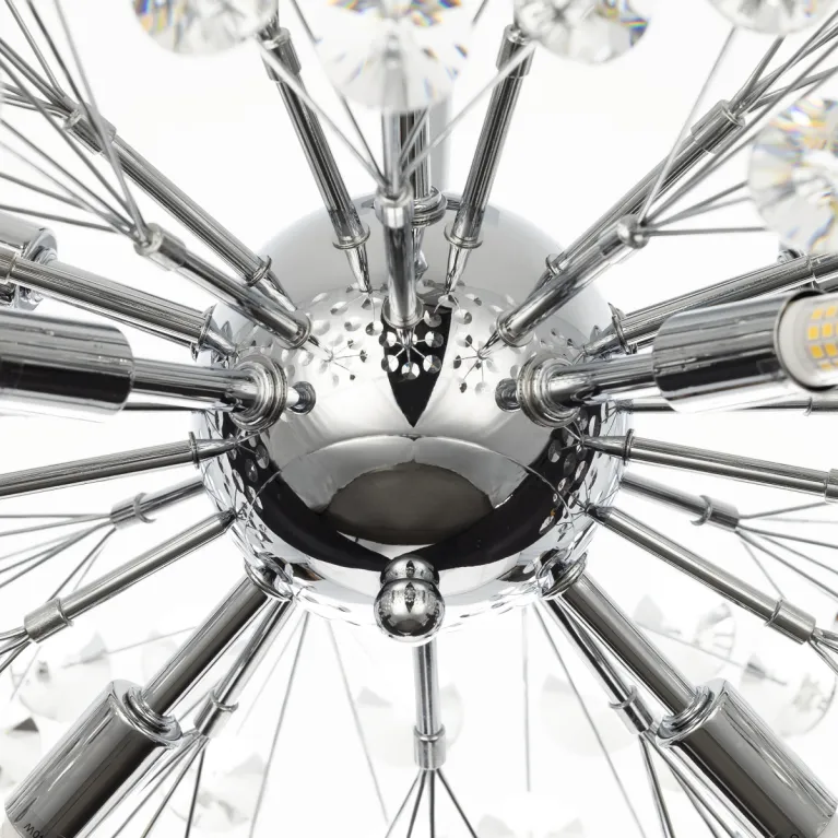 Преобладающий цвет плафонов: Прозрачный, арматуры: Хром; материал изготовления арматуры: Металл, размеры, мм: / высота 400 / диаметр 450. Общая мощность – 320 Ватт, а максимальная площадь освещения до 19 м2. Основной тип ламп, предусмотренный производителем: Галогеновая с цоколем G9. В зависимости от предпочтений можно использовать лампы теплового, холодного или нейтрального света, за исключением люстр с типом цоколя LED.