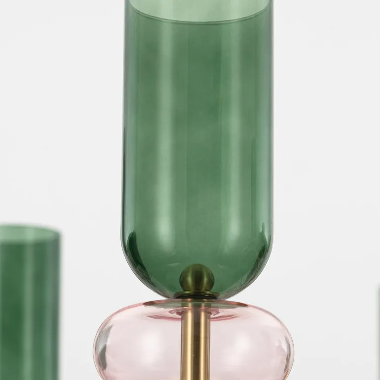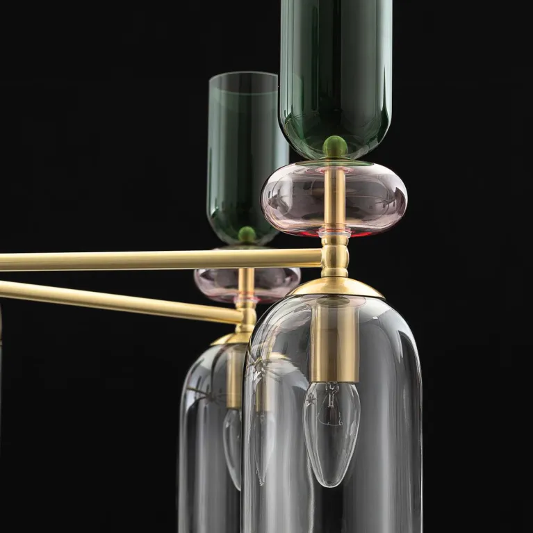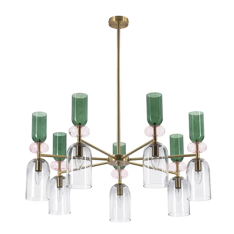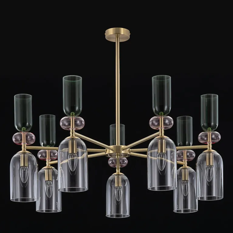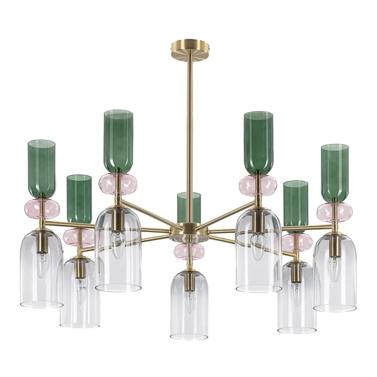 Преобладающий цвет плафонов: Разноцветный, арматуры: Латунь; материал изготовления арматуры: Металл, размеры, мм: / высота 930 / диаметр 850. Общая мощность – 420 Ватт, а максимальная площадь освещения до 23 м2. Основной тип ламп, предусмотренный производителем: Накаливания с цоколем E14. В зависимости от предпочтений можно использовать лампы теплового, холодного или нейтрального света, за исключением люстр с типом цоколя LED.